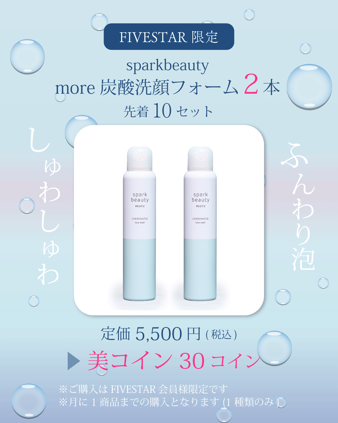今回、FIVESTAR会員様限定商品として、リピーター続出の「sparkbeauty more炭酸洗顔フォーム」を2本セットでご用意いたしました。