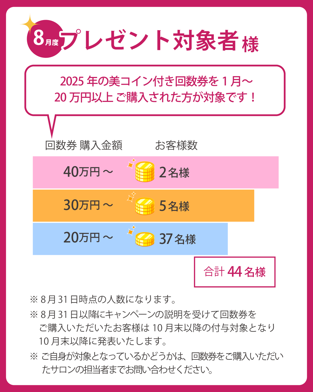 今回の対象者は2025年1月1日~8月31日までに、対象の美コイン付き回数券を購入いただき、合計金額が条件に達したお客様です。