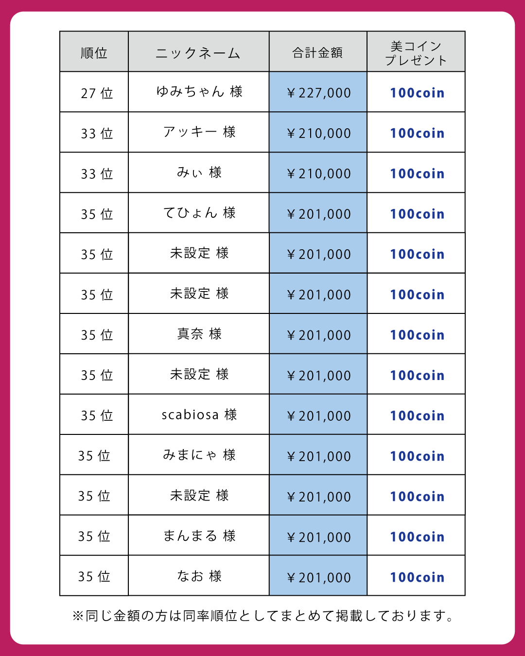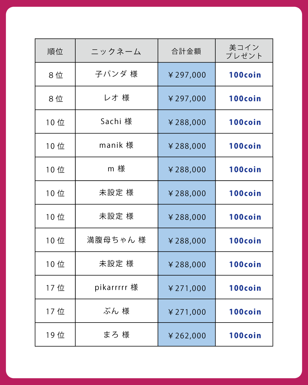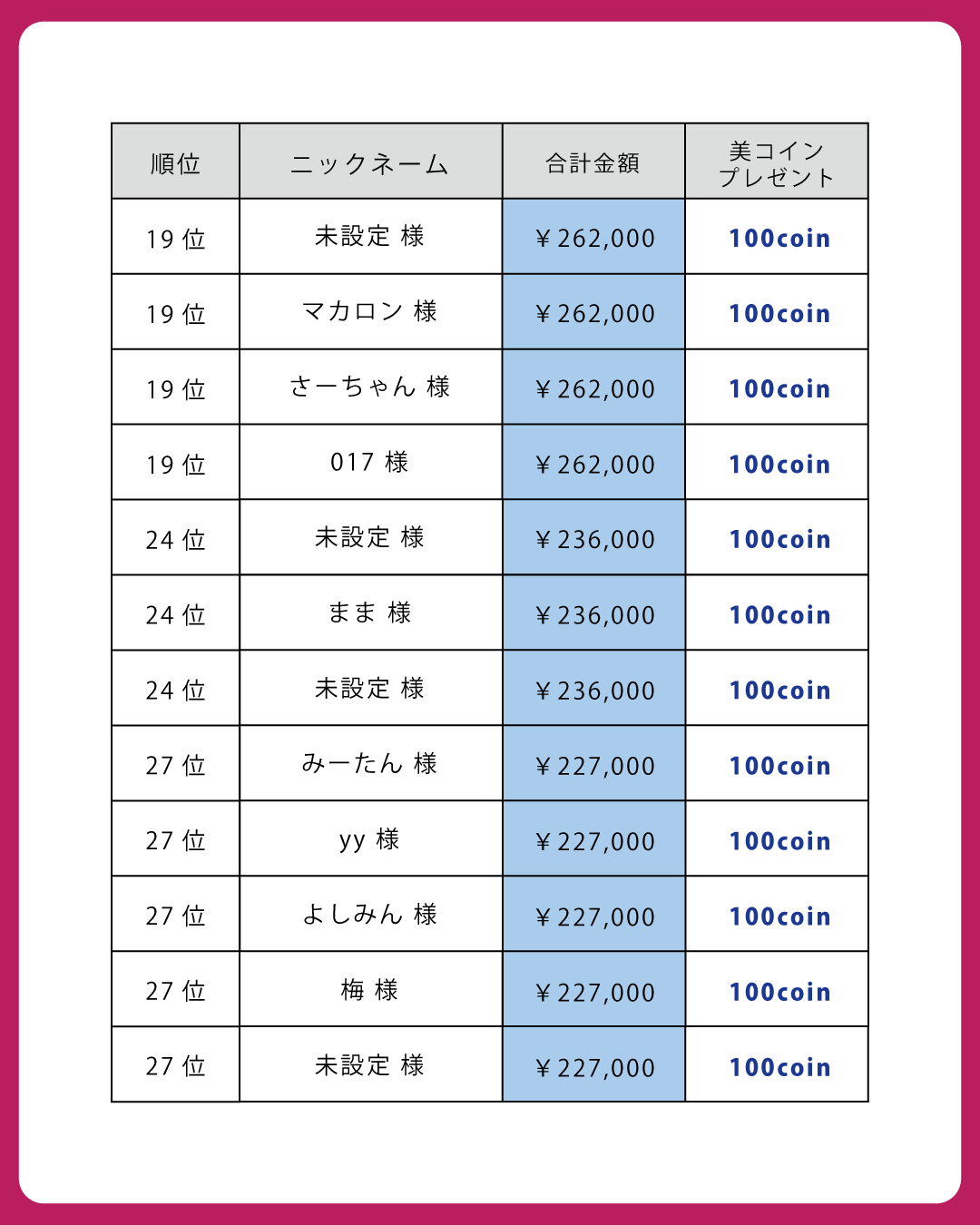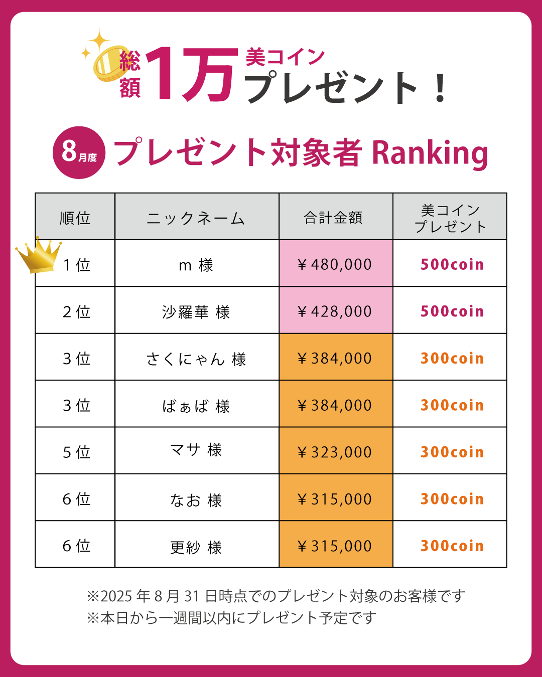 本日は、8月末までに条件を満たし、美コインプレゼントの対象となったお客様を発表いたします!