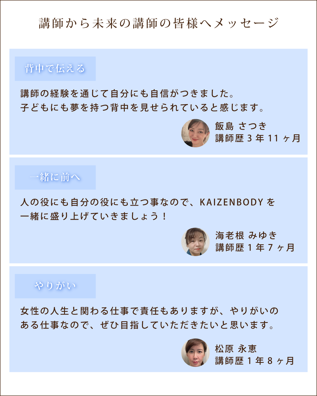 技術指導だけでなく、教え方やコミュニケーションも基礎から学べるので、「人に教えるのは初めて…」という方でも大丈夫。