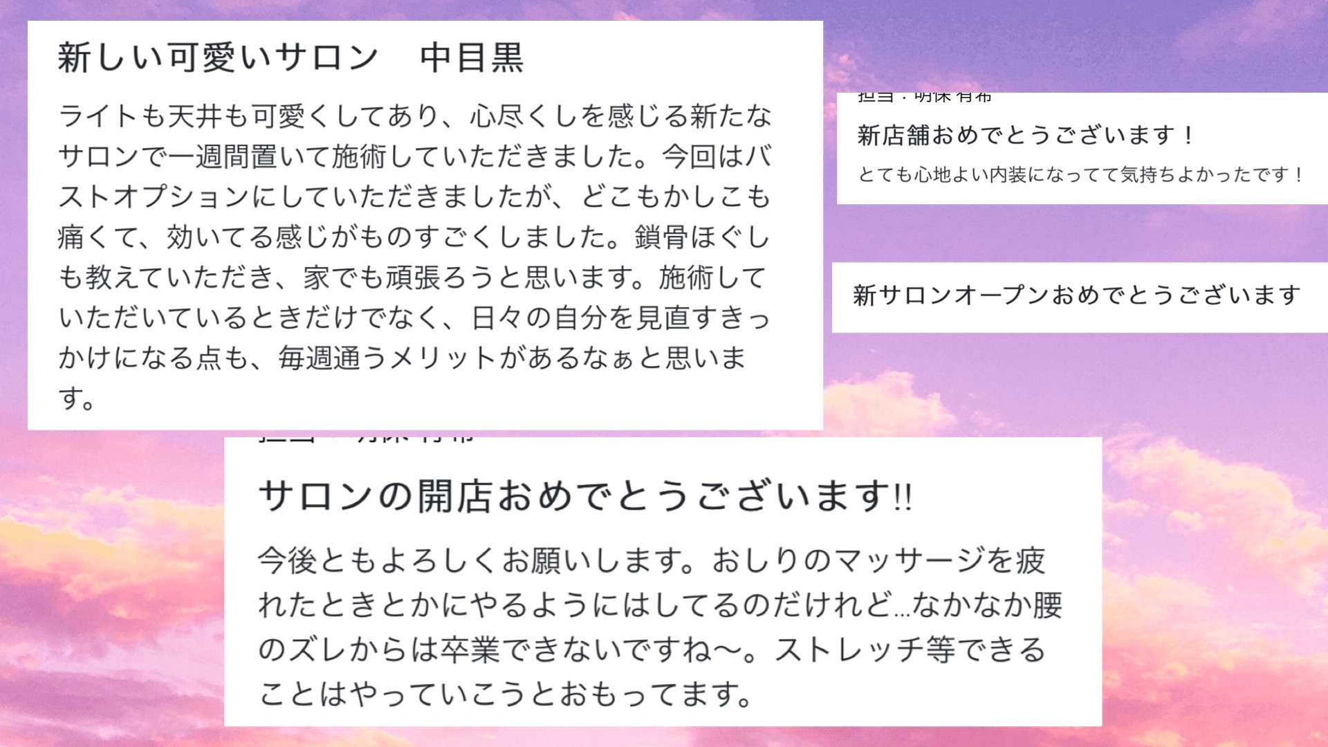 現在、お問い合わせが何十件等殺到しており、ご連絡が追いつかない状態です。 順にご返答等させて頂いております。 ご心配等おかけしてしまい申し訳ございません。 ※お電話でのお問い合わせについて 施術中は出れない為、お客様のお着替え中など合間合間でメールにてご返信をさせて頂いております。ショートメールまたは...