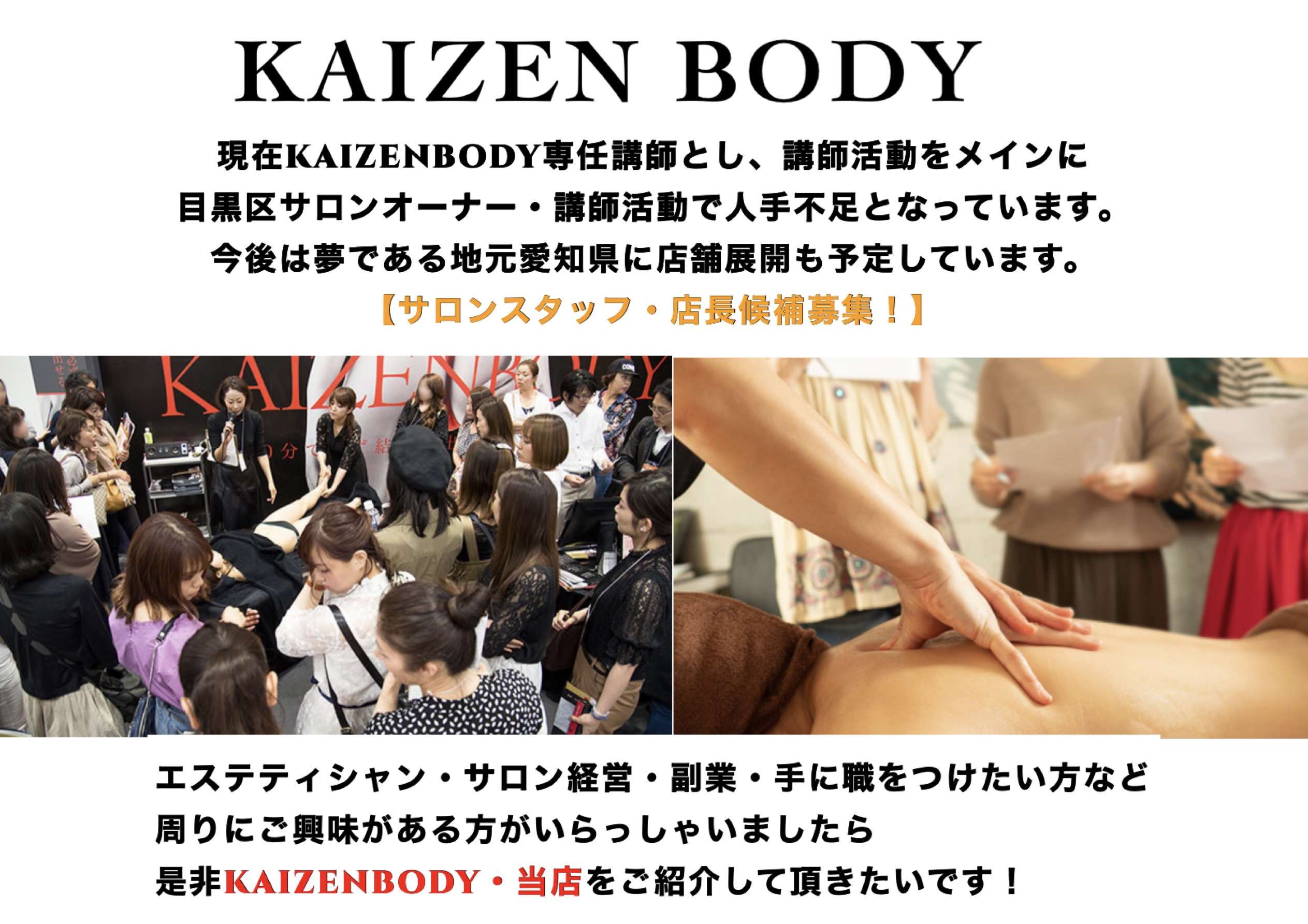未経験OK.副業ok.将来自分のサロンを出したい方.やる気のある方OK.美容が好き.手に職をつけたい.喜んでもらえる仕事がしたい方.サロンを出したいが場所がない方.エステティシャンにご興味のある方.kaizenbodyの技術ファンな方など