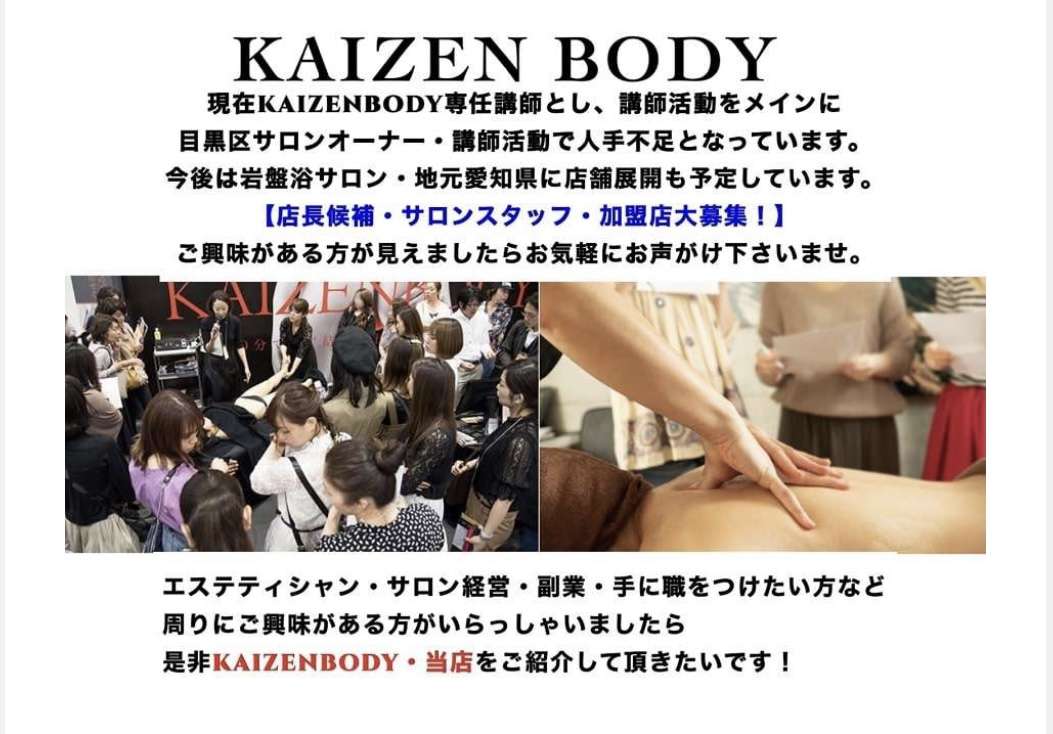 空いてる時間〜フルタイムok.未経験OK.副業ok.将来自分のサロンを出したい方.やる気のある方OK.美容が好き.手に職をつけたい.喜んでもらえる仕事がしたい方.サロンを出したいが場所がない方.エステティシャンにご興味のある方.kaizenbodyの技術ファンな方など