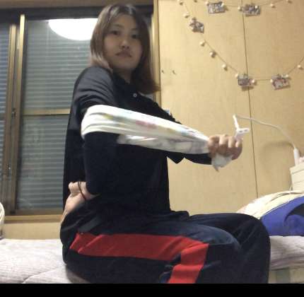 写真のようにタオルに腕を通して、手の甲を腰につけて、痛くなりすぎないように前に引っ張ります!そうする事で肩の後ろの筋肉が伸びていいみたいです!これを一回左右で30秒ずつやっています!