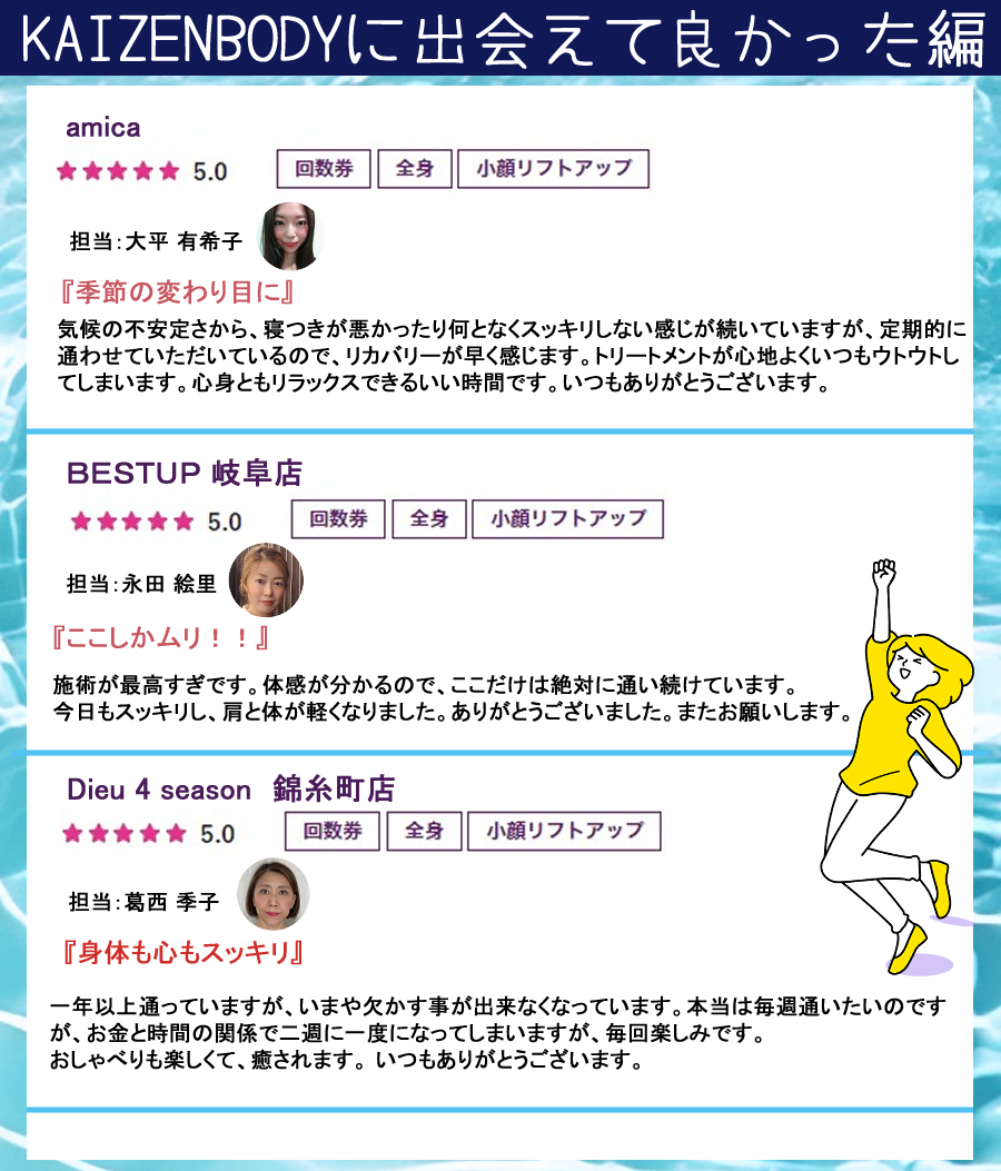 身体の悩みを改善したいと思われた方は是非KAIZENBODYのサロンをご利用下さい。