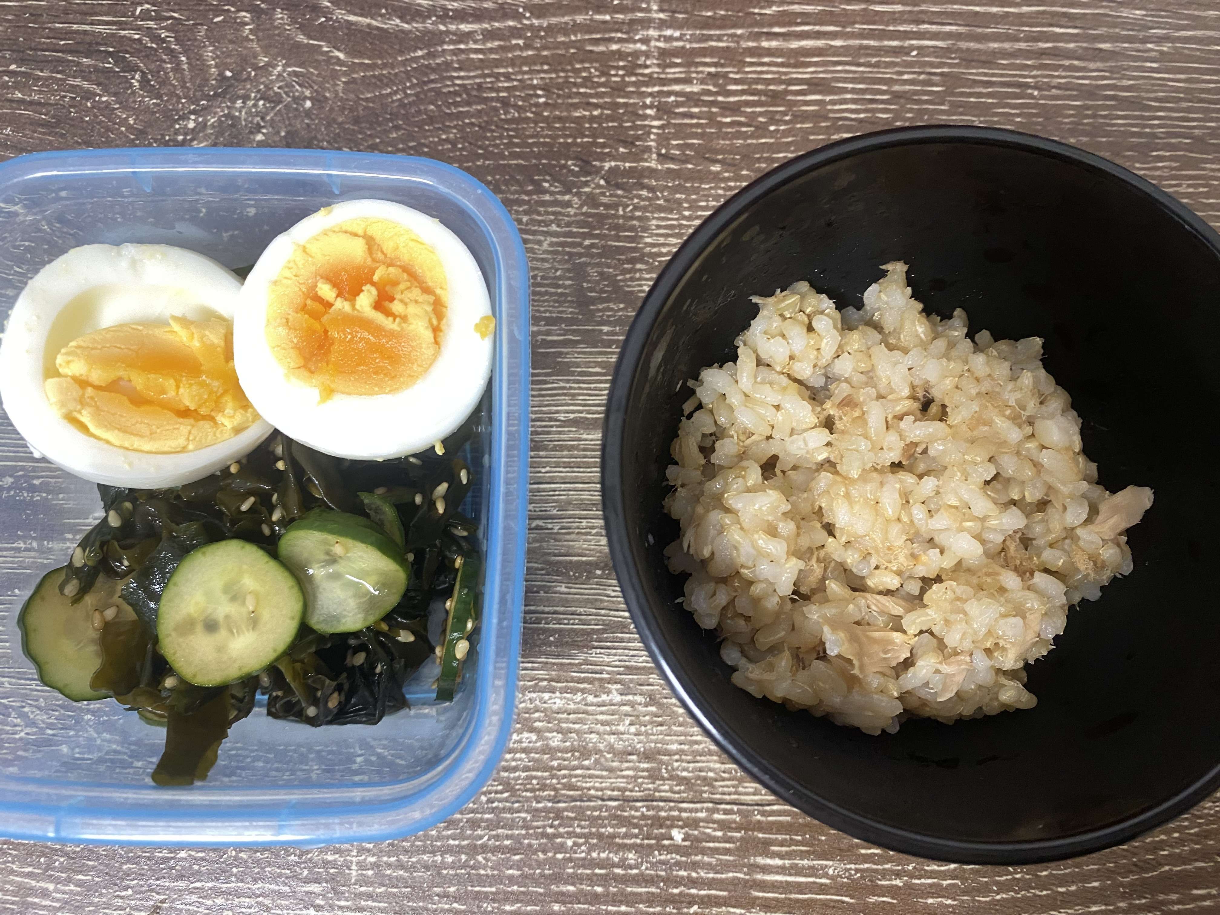 わかめときゅうりの酢の物・ツナご飯・ゆで卵を