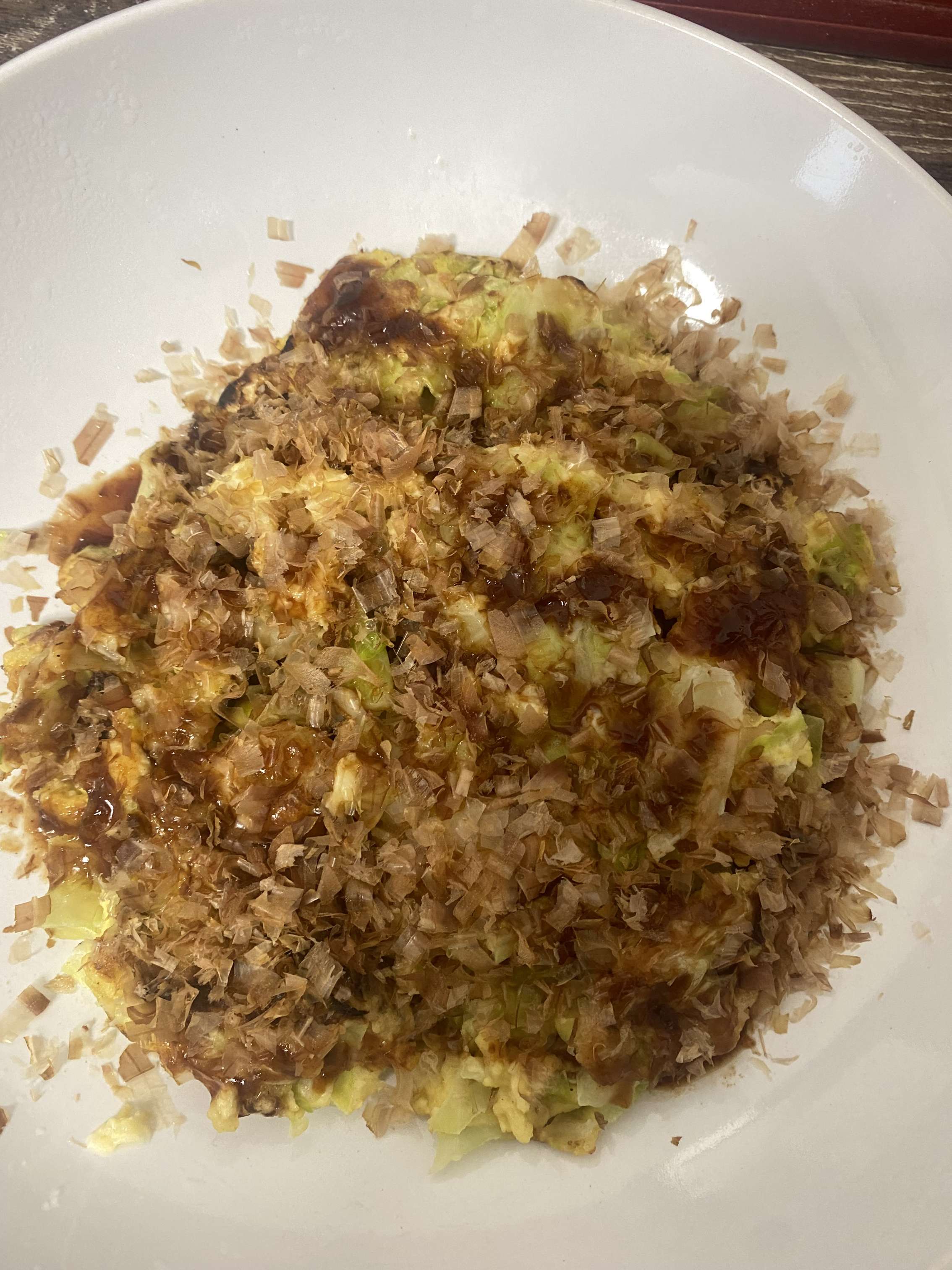 夜ご飯は、豆腐とキャベツのお好み焼きです!