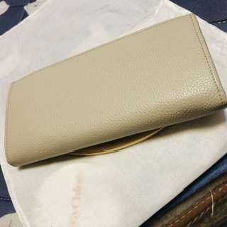 ホワイトに近いベージュ。開閉部の金の金具。お値段も安く。それで決めました。