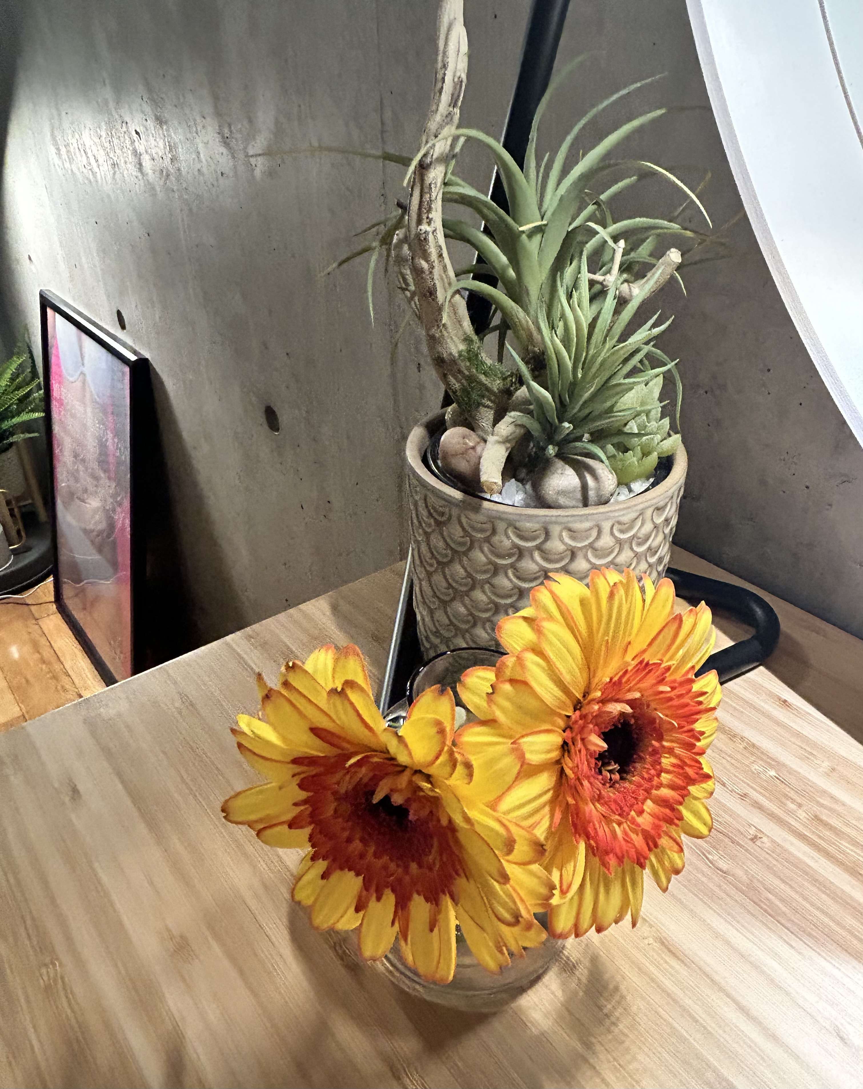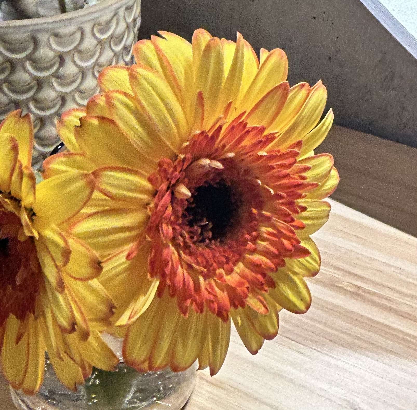 黄色とオレンジの珍しいツートンカラーのガーベラが素敵でした。