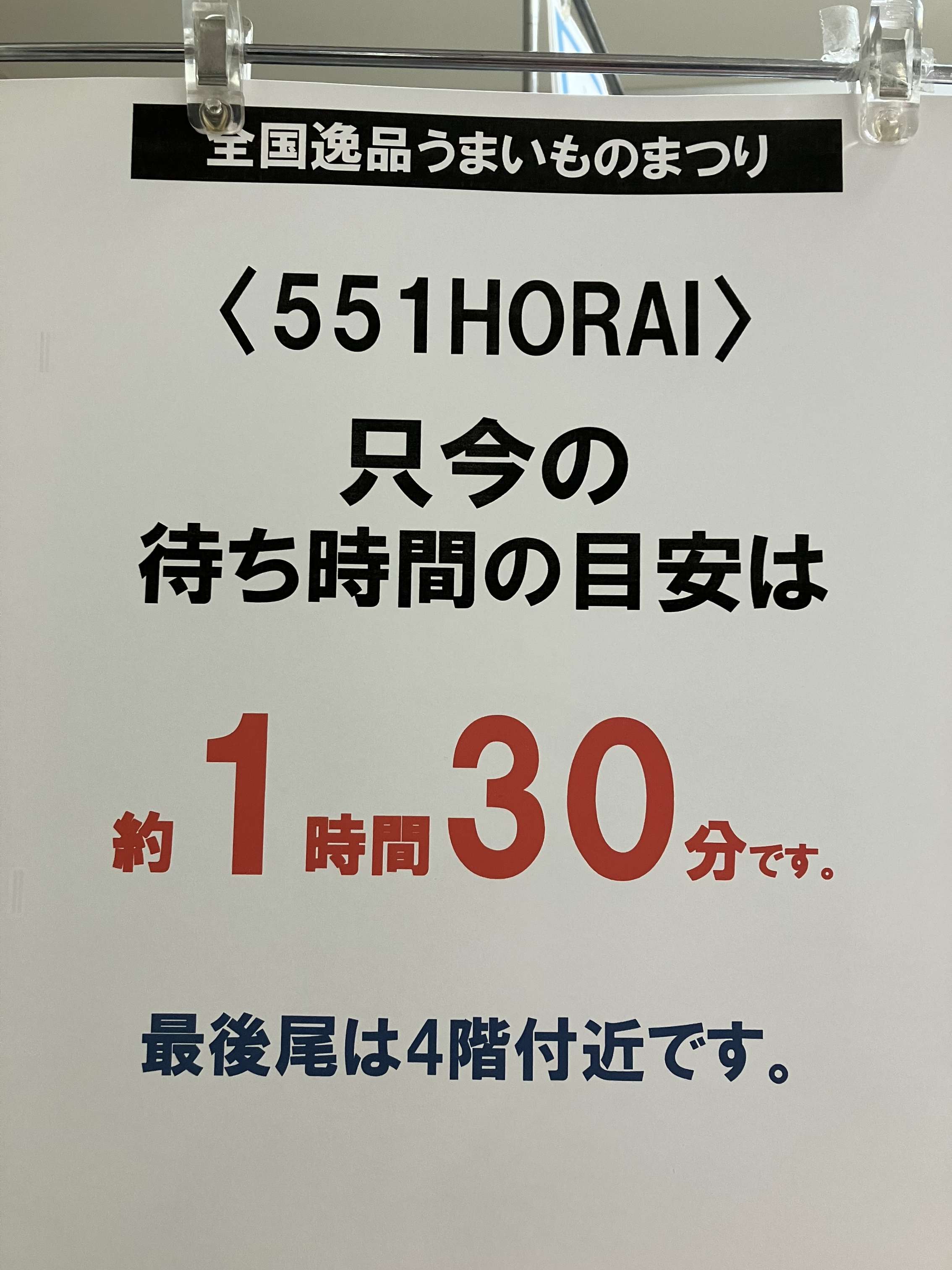 広告を見て、551の肉まんを購入したかったのですが、なんと1時間半待ち。7階の会場でしたが、4階からすでに列ができているとのこと。551の人気の高さにおどろきました。