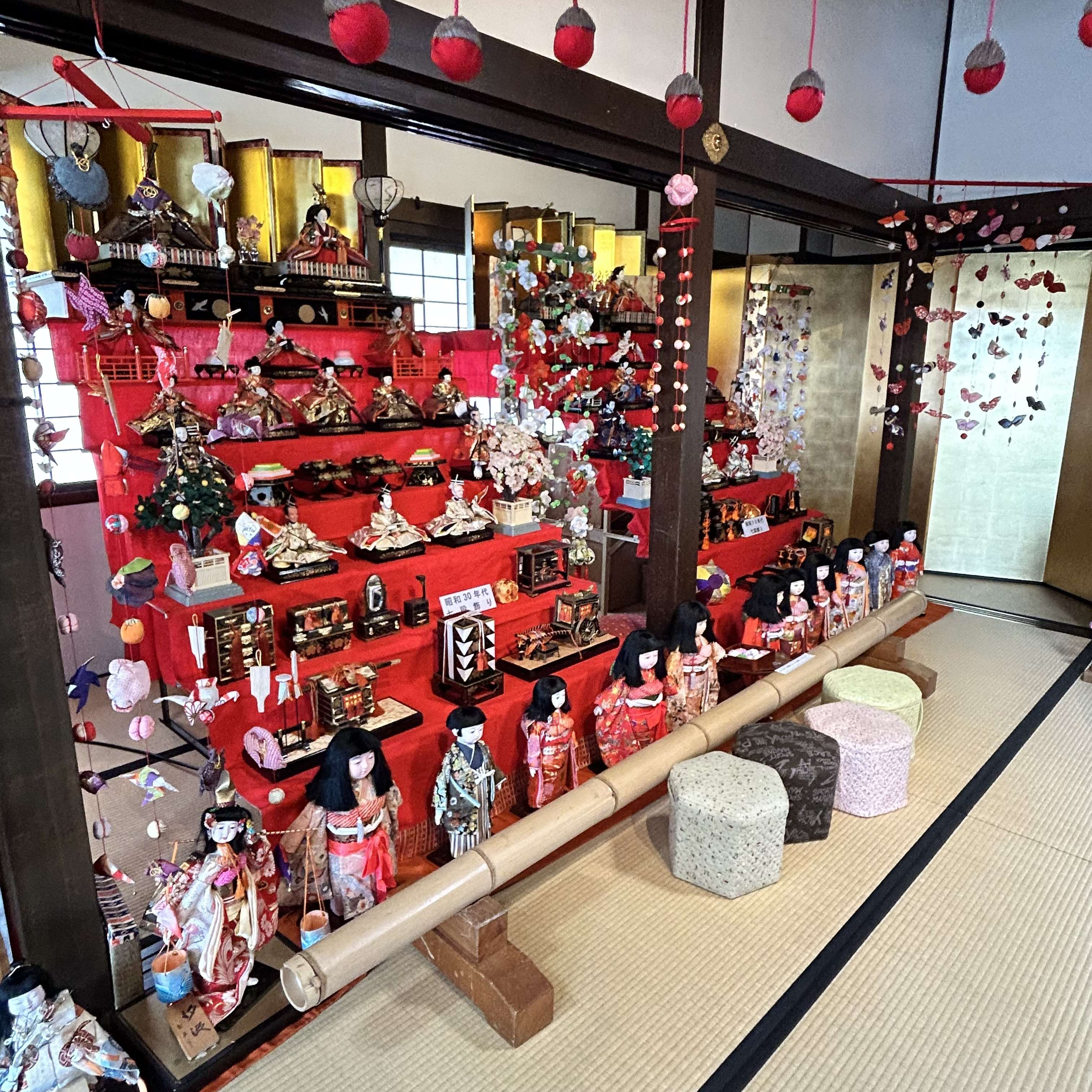 この時期は広い和室にたくさんの段飾りの雛人形が飾られます。