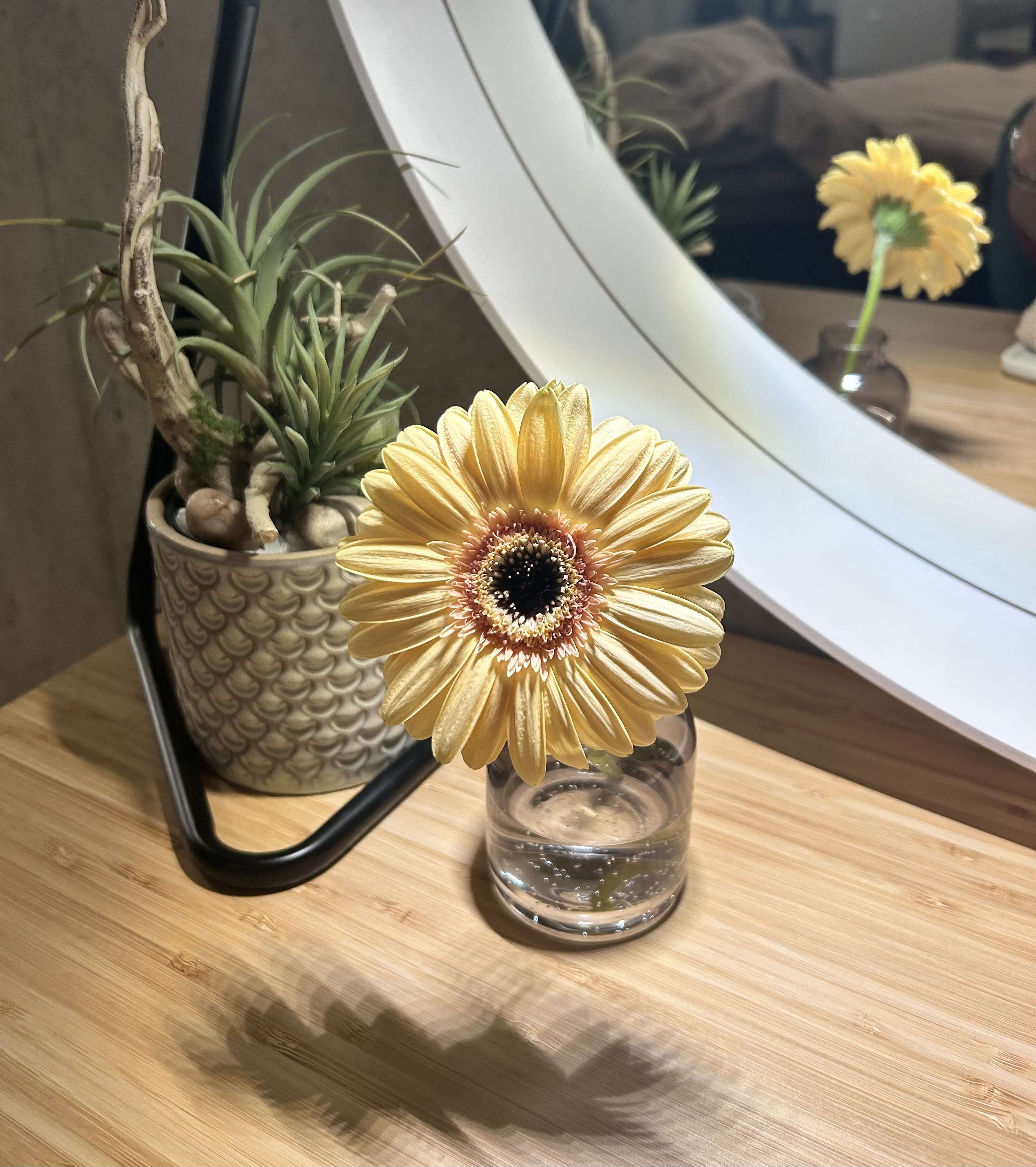 普段見るガーベラよりも大きくて、色はベージュ?アイボリー?