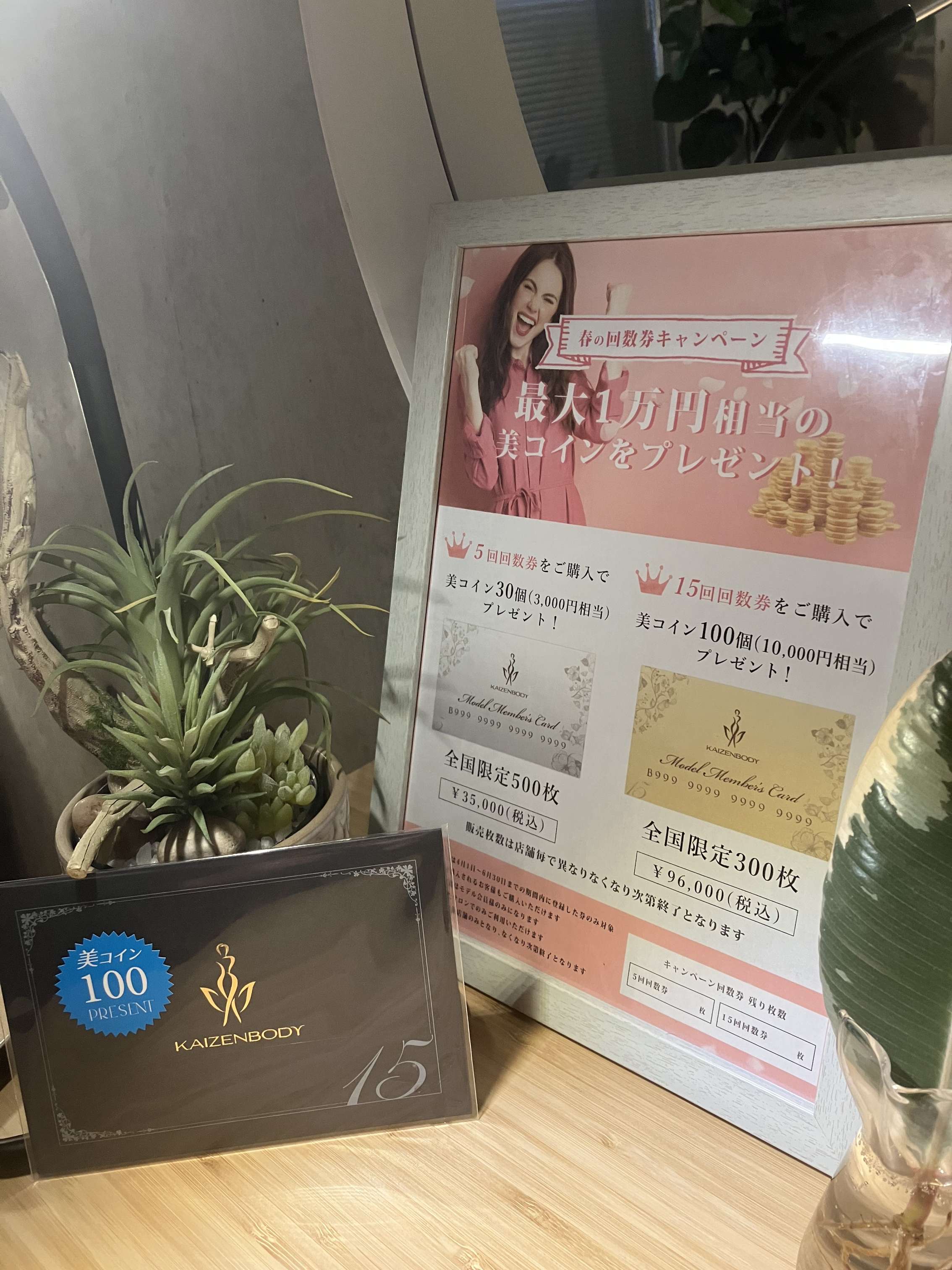 前の回数券もあるので、月に3回のペースで通えます☺️美コインで買い物をするのも楽しみですし、KAIZENBODYの施術がたくさん受けられるのも嬉しいです!!