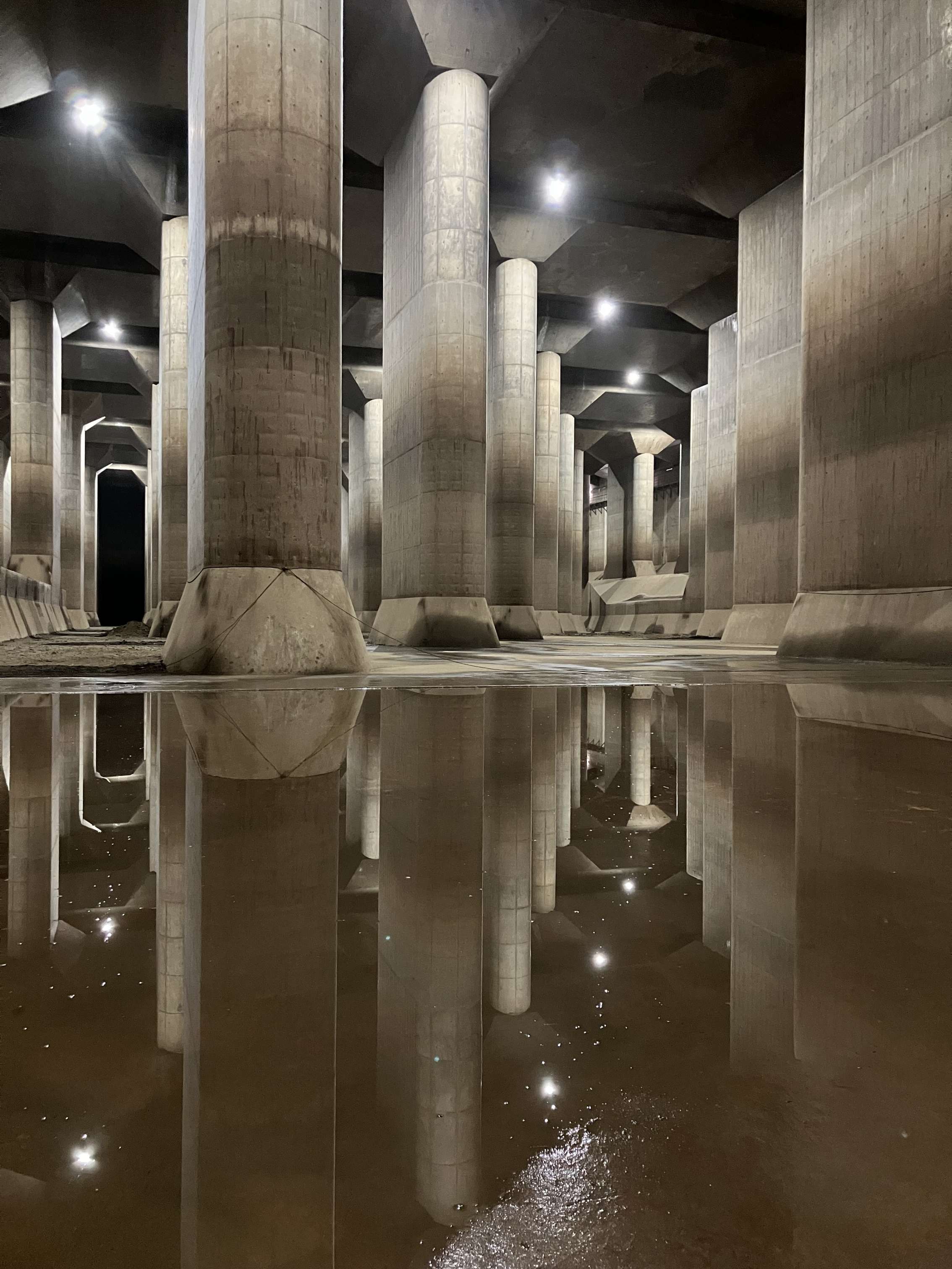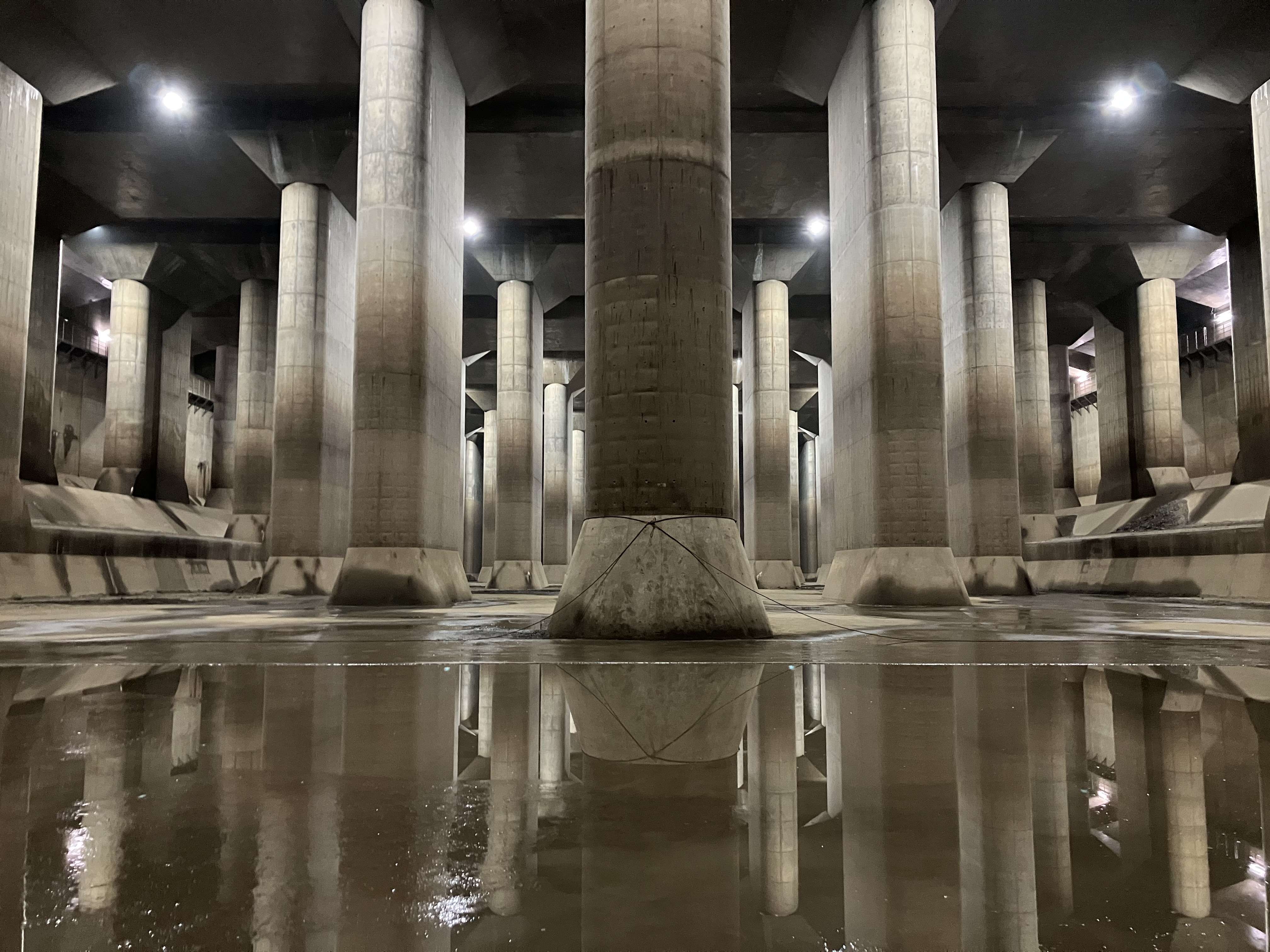 日本の首都圏での水害を軽減することを目的とした施設で、埼玉県にあります。高さ18メートル、重量500トンの巨大な柱59本が天井を支える光景が神殿のように見えるためメディアなどで地下神殿と言われるようになったそうです。