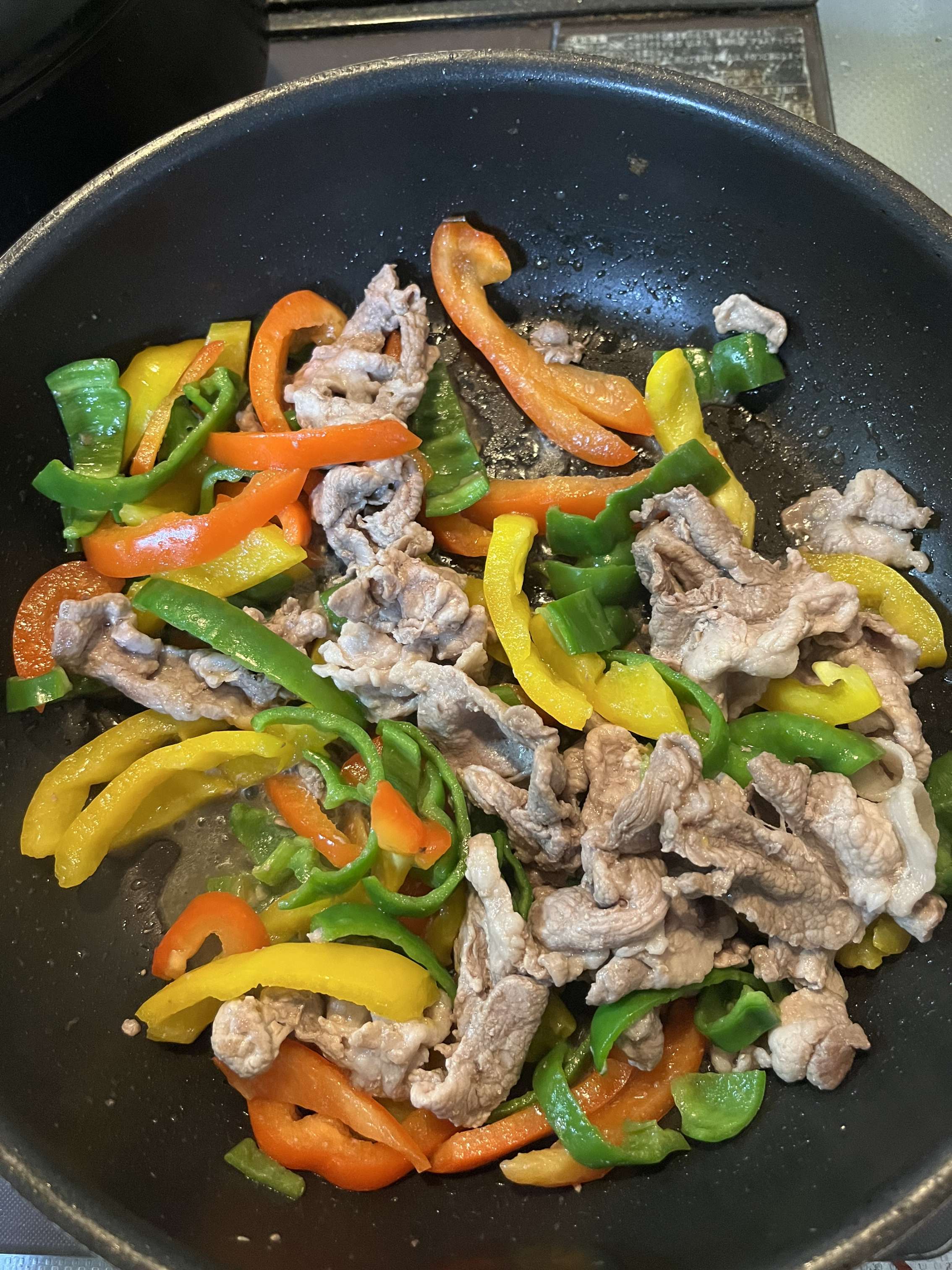 お肉と炒めました。赤黄緑の野菜の色が鮮やか