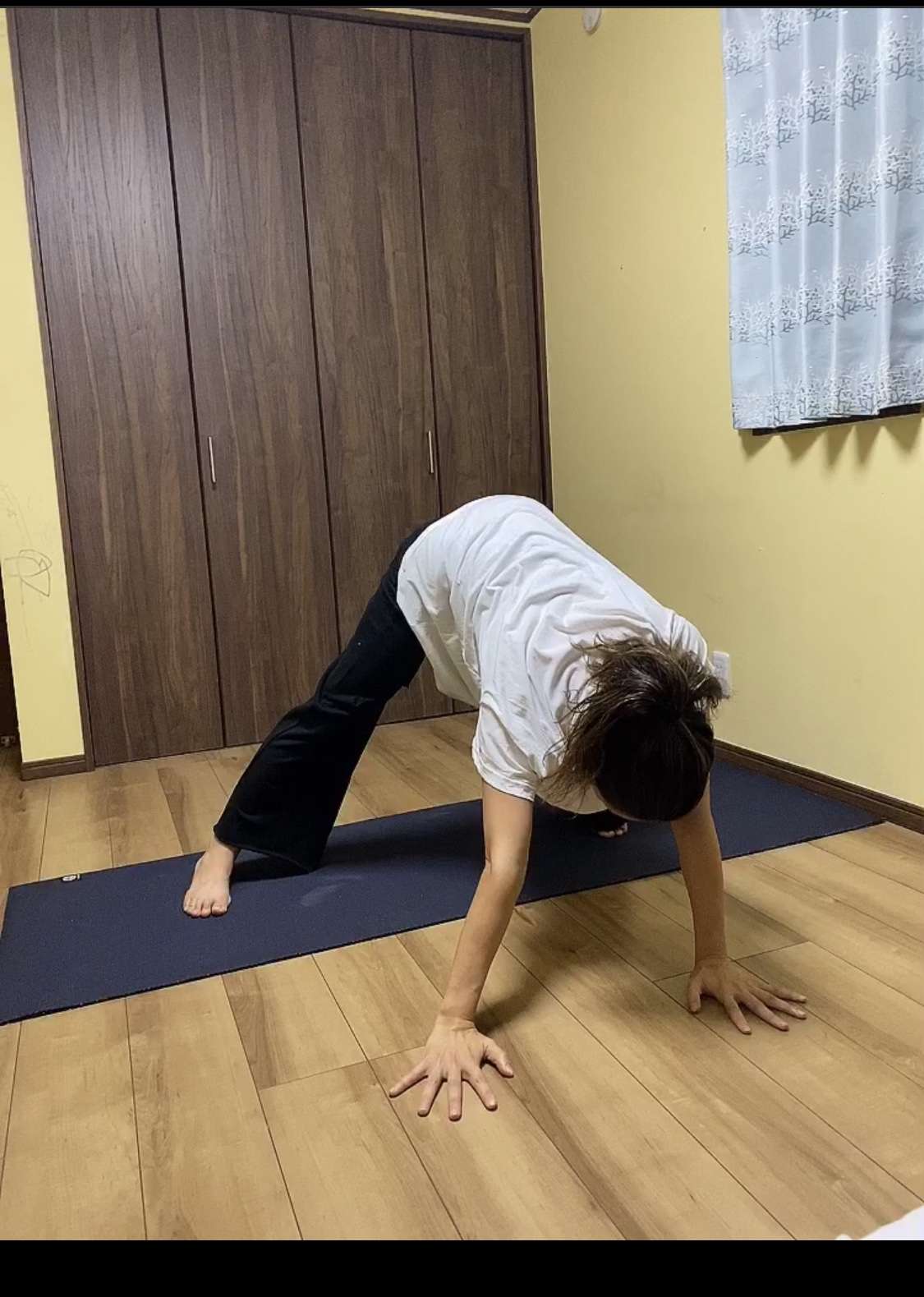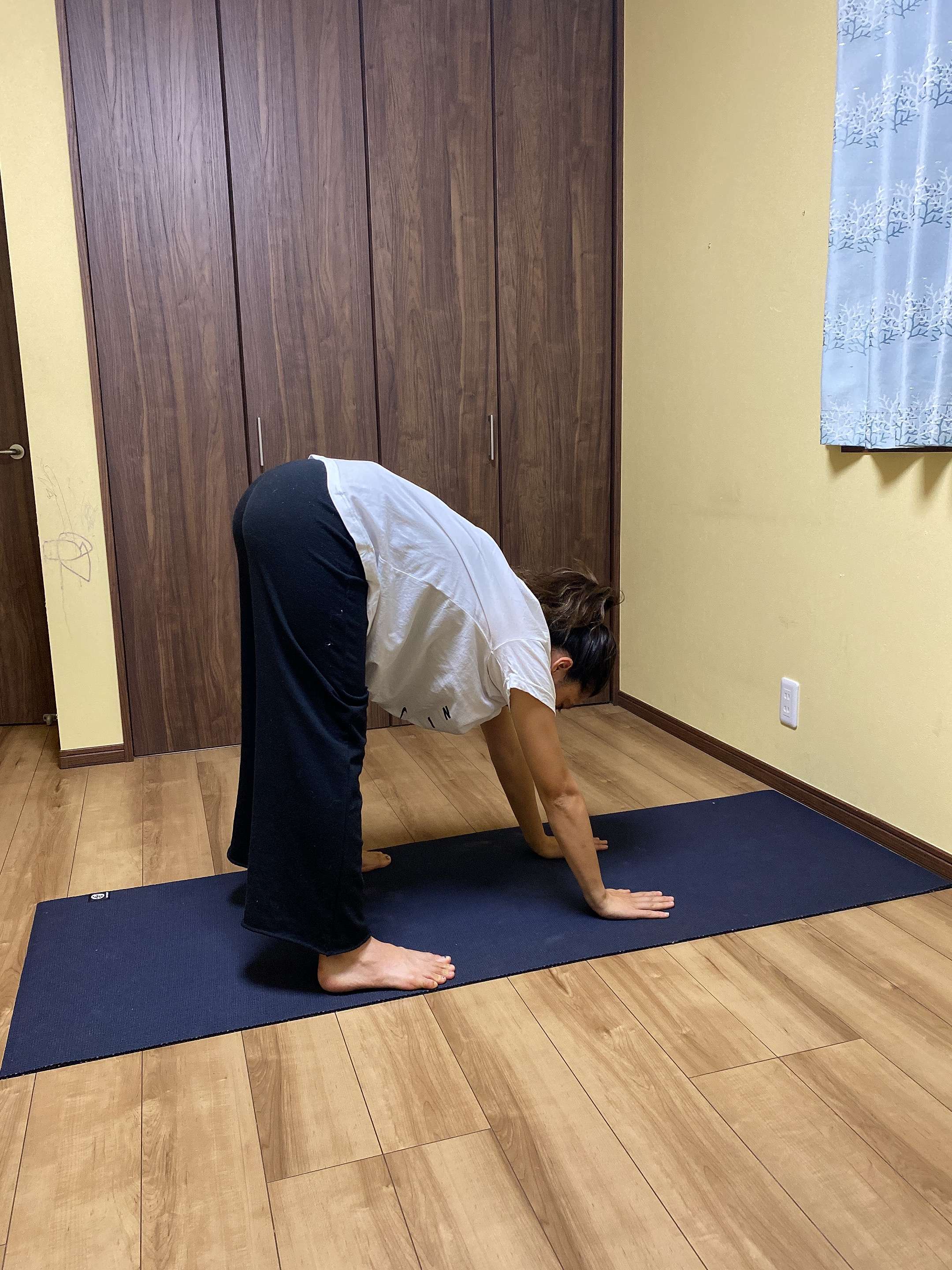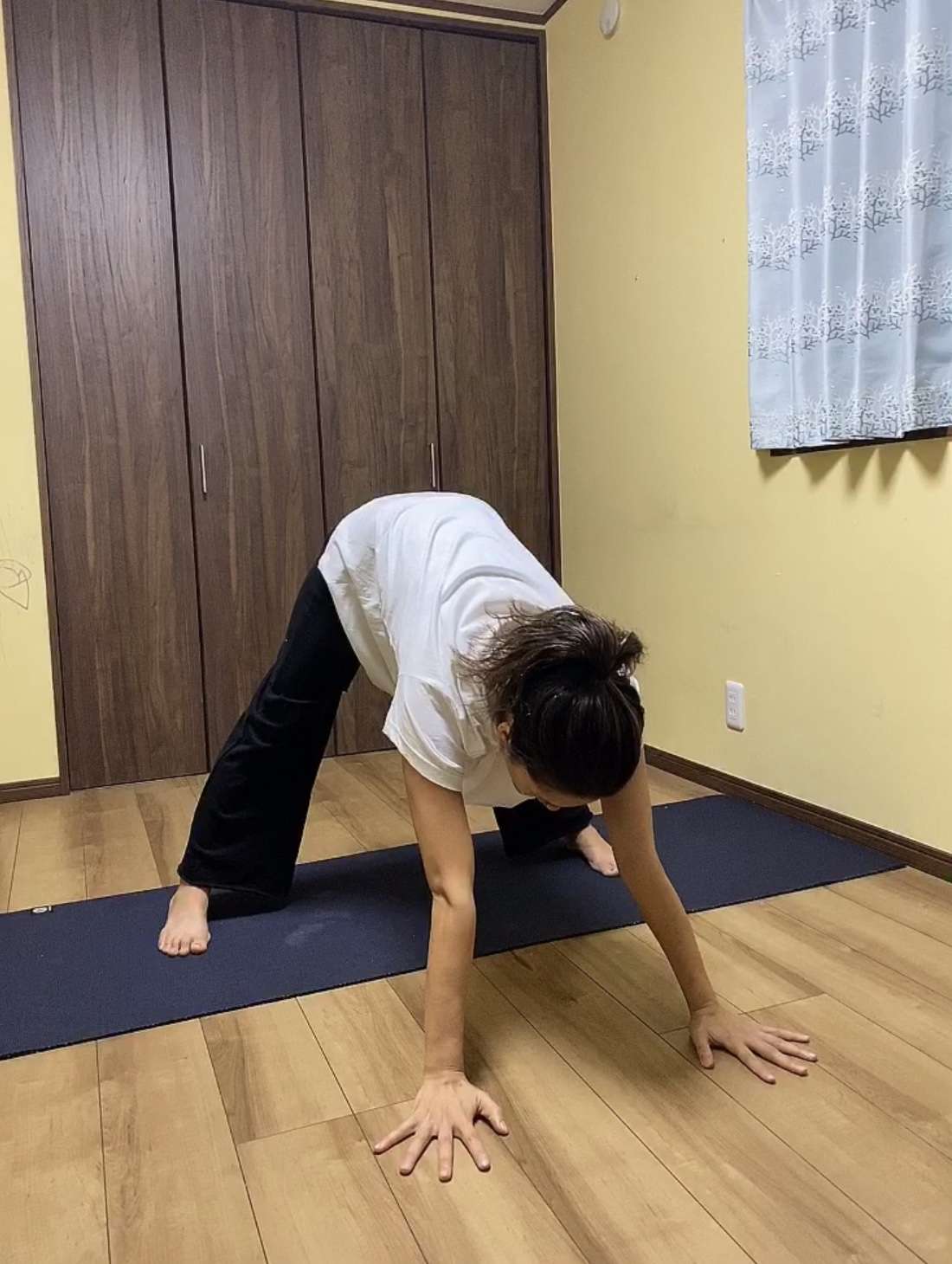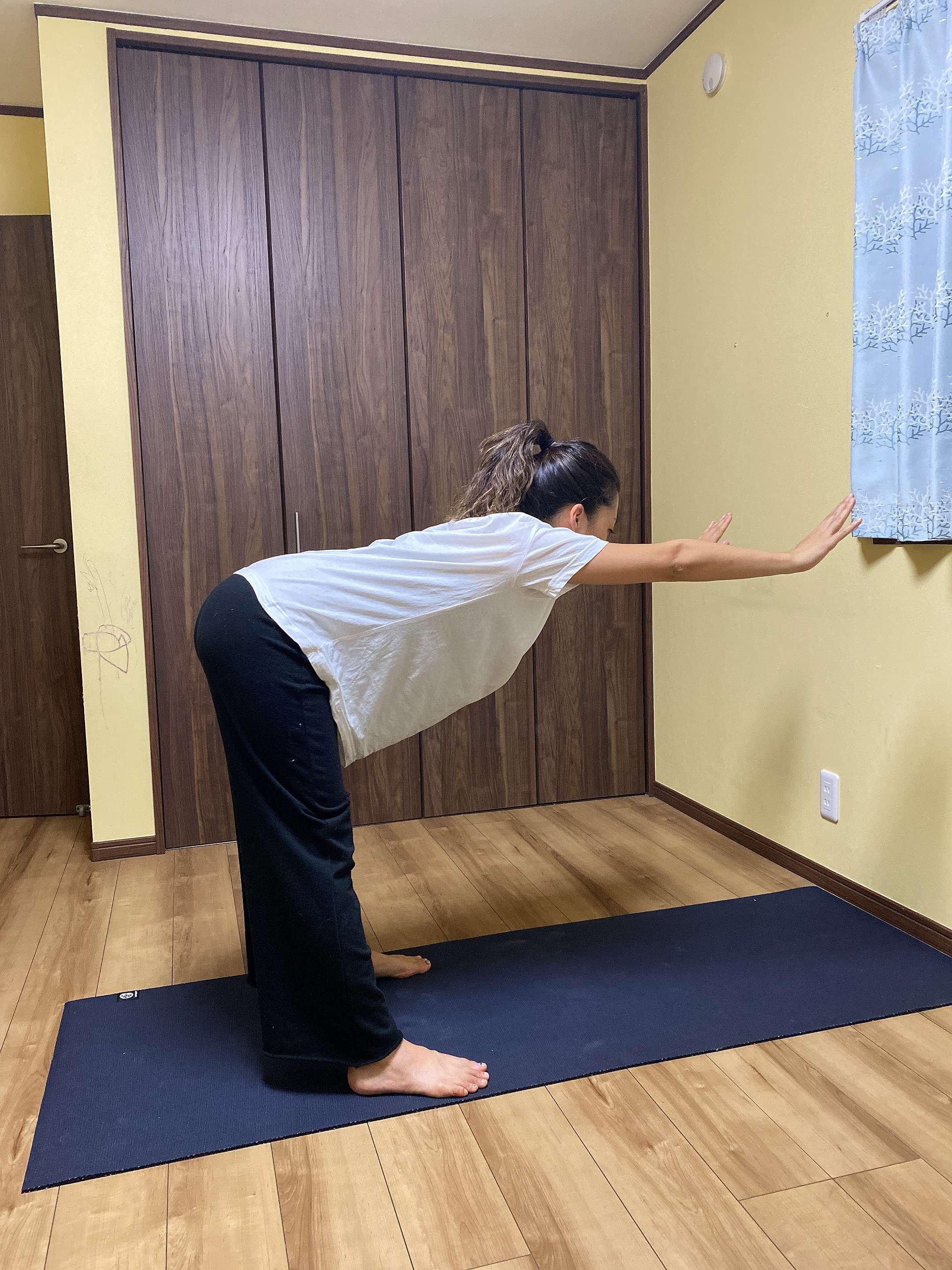①万歳してたち、お尻を壁に突き出しながら上半身を倒します