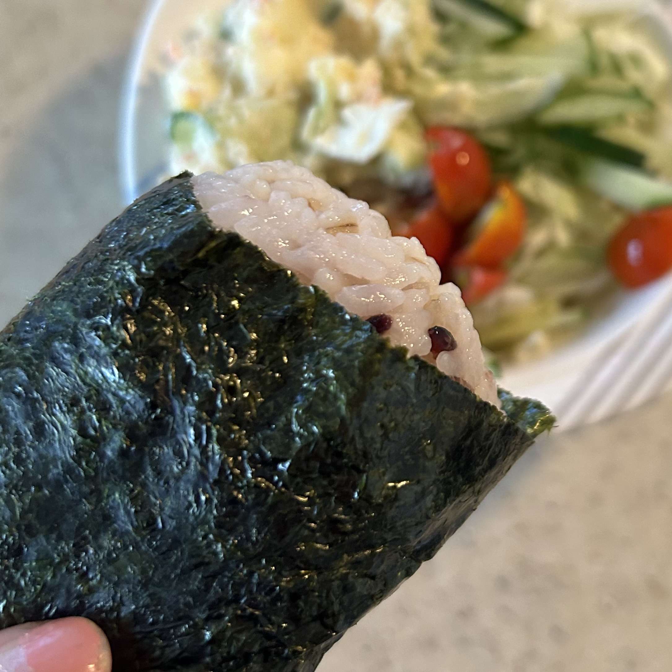 冷凍保存してあるので、食べる時はラップのままレンチンし、ラップのまま形を整えて海苔を巻きます。