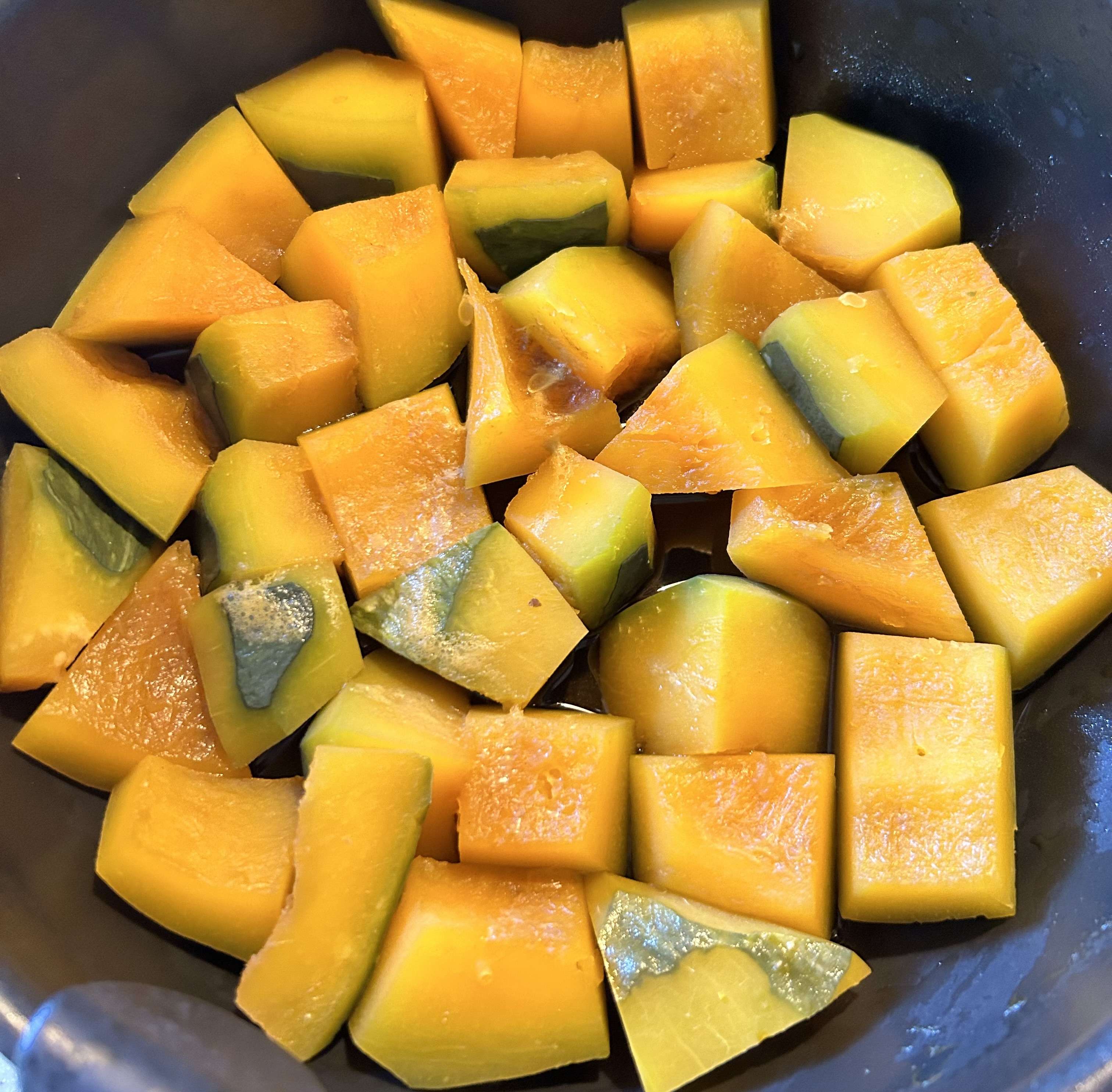 レシピの倍量の、カボチャ半分をカットし、面取りもしました。