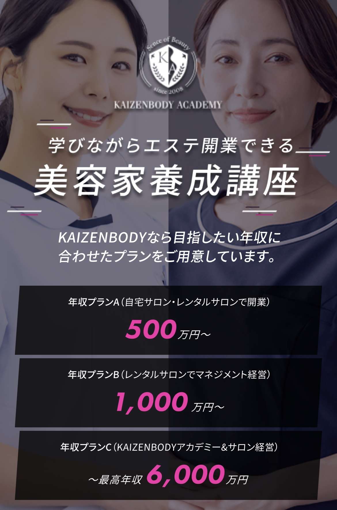 KAIZENBODYアカデミーの講座は、プロの美容家を養成する講座です。質の高い技術力を身につけるのは当たり前。本物の美容家になり、プロとしてお金が稼げるところまで養成できる教育システムになっています。