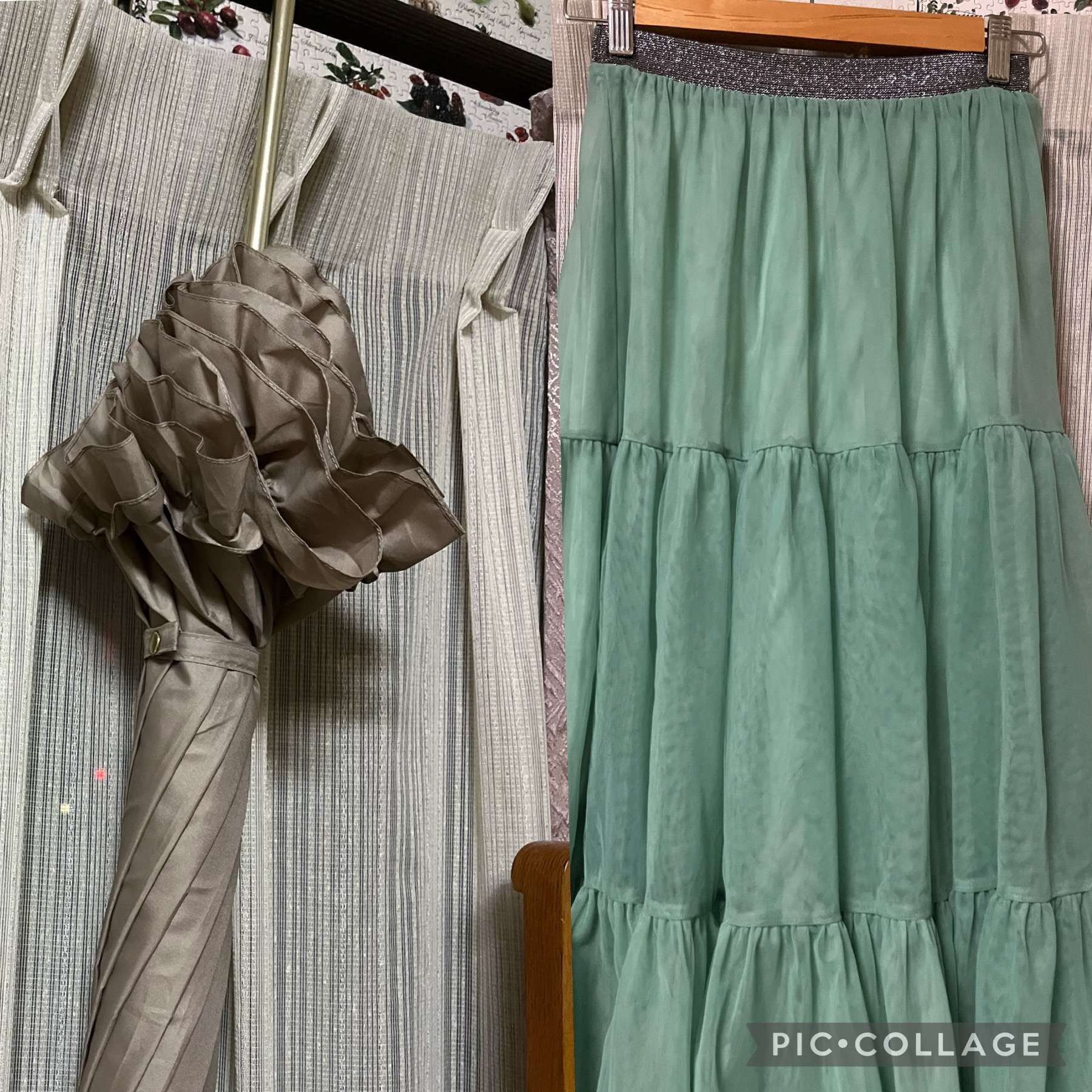 そして淡いグリーンのフレアーロングスカートです。可愛いの好きなんですよね。可愛い過ぎるから着れないとやめました