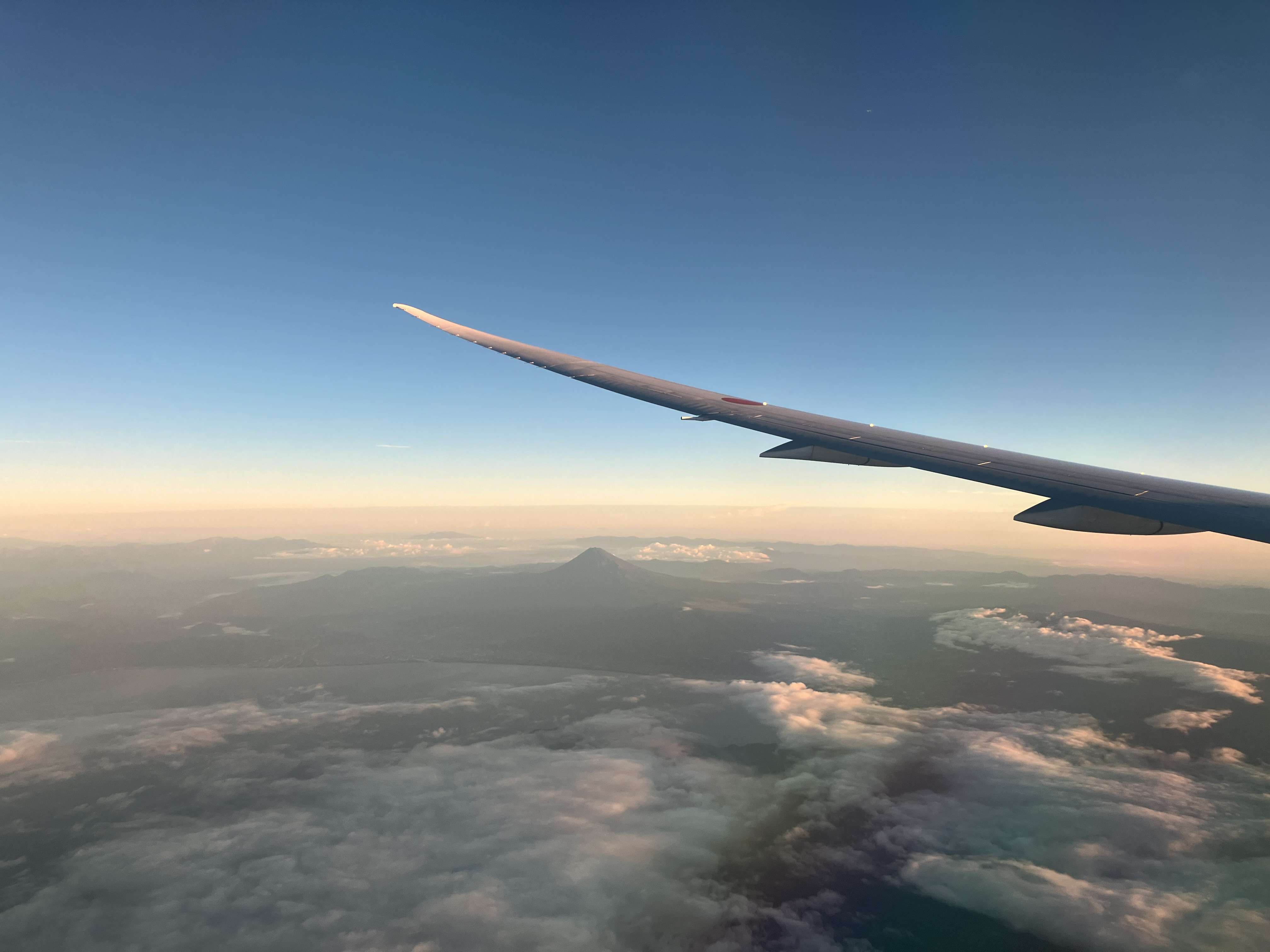 写真は羽田空港へ向かう途中に見た富士山です。朝到着だったので、空もとても綺麗でした。