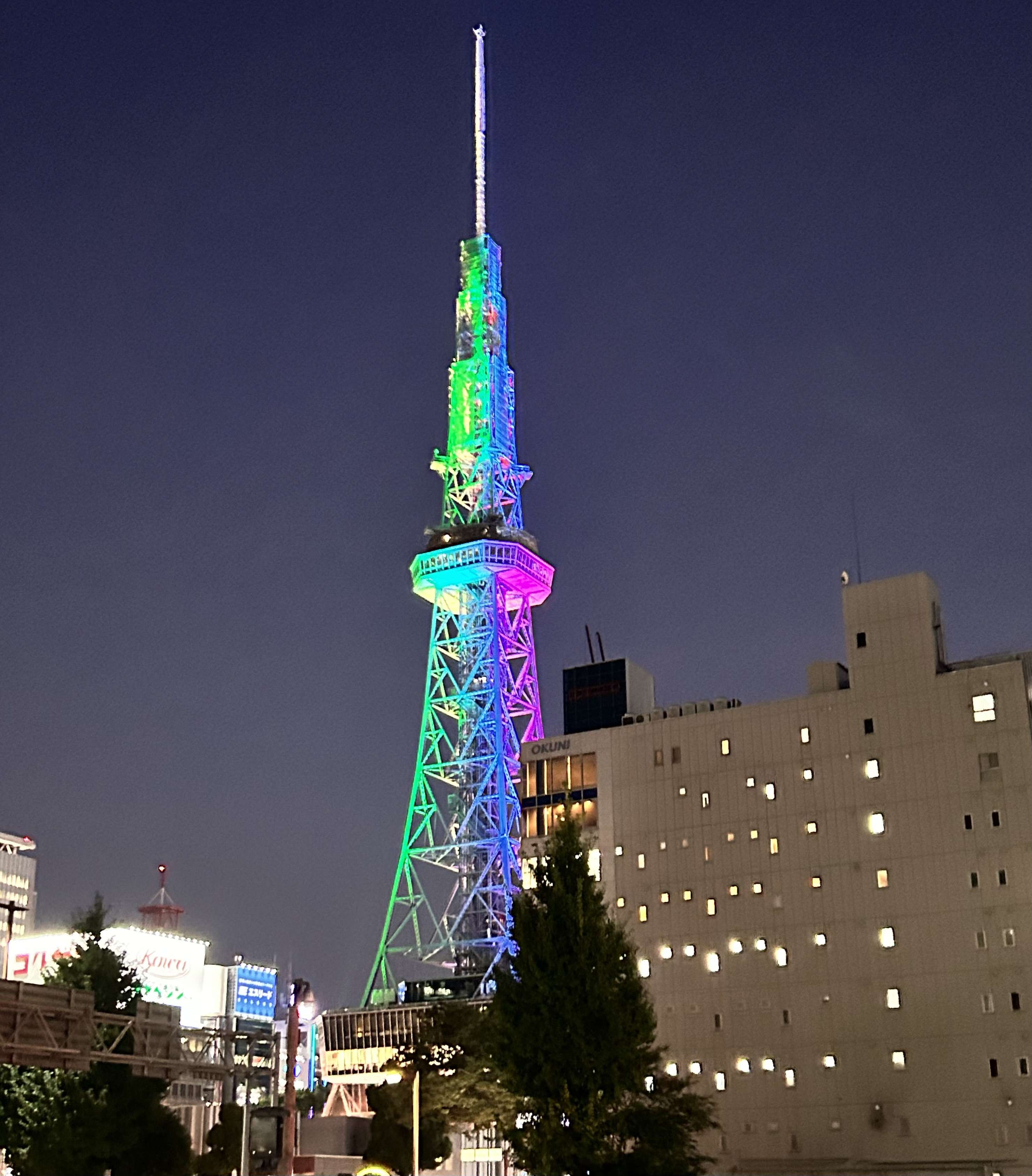 途中に名古屋テレビ塔ミライタワーがありますが、虹色?になってました。