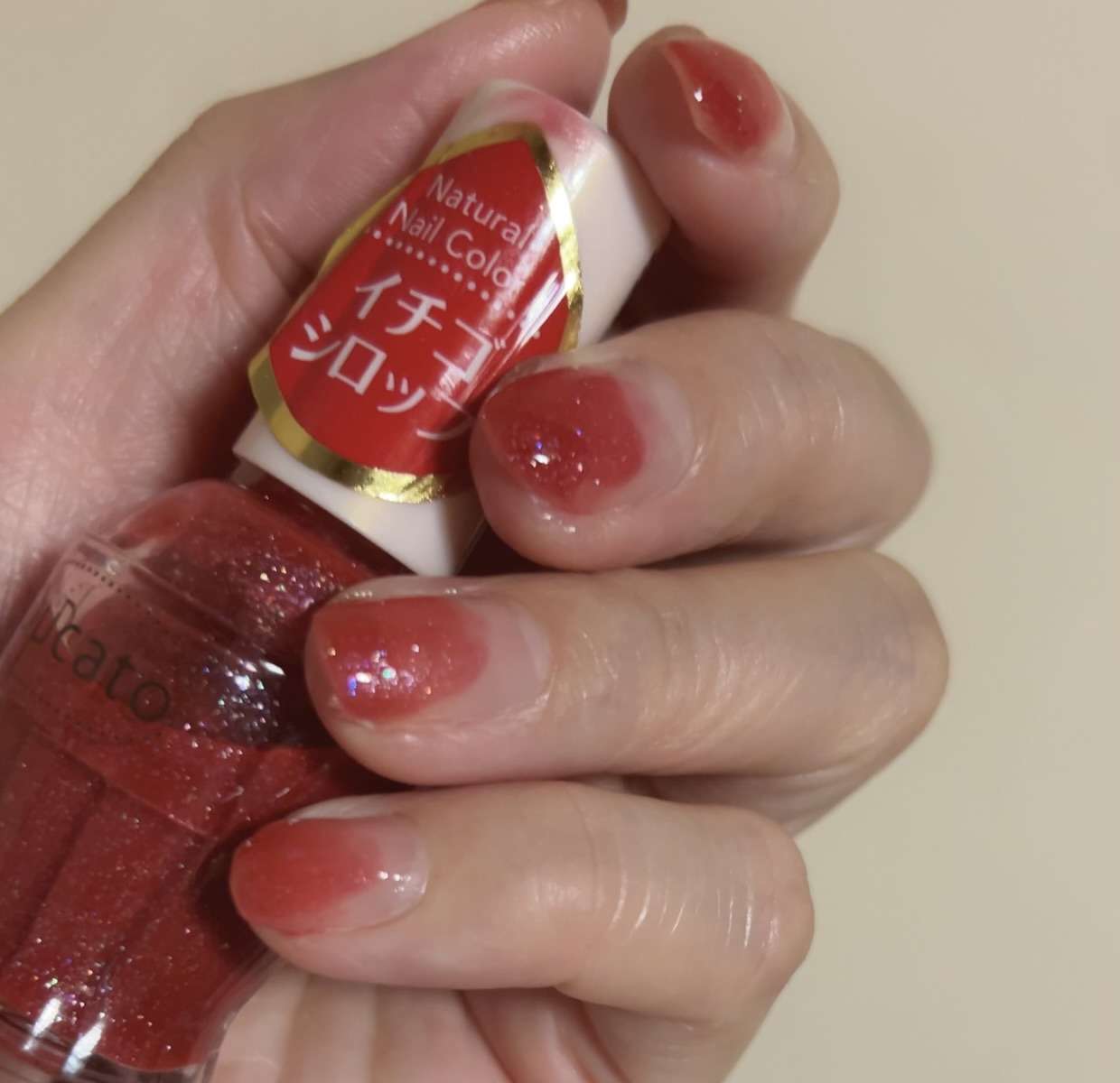 ベースコートの上に、『イチゴシロップ』という美味しそうなネイルをグラデーション気味に塗ります。
