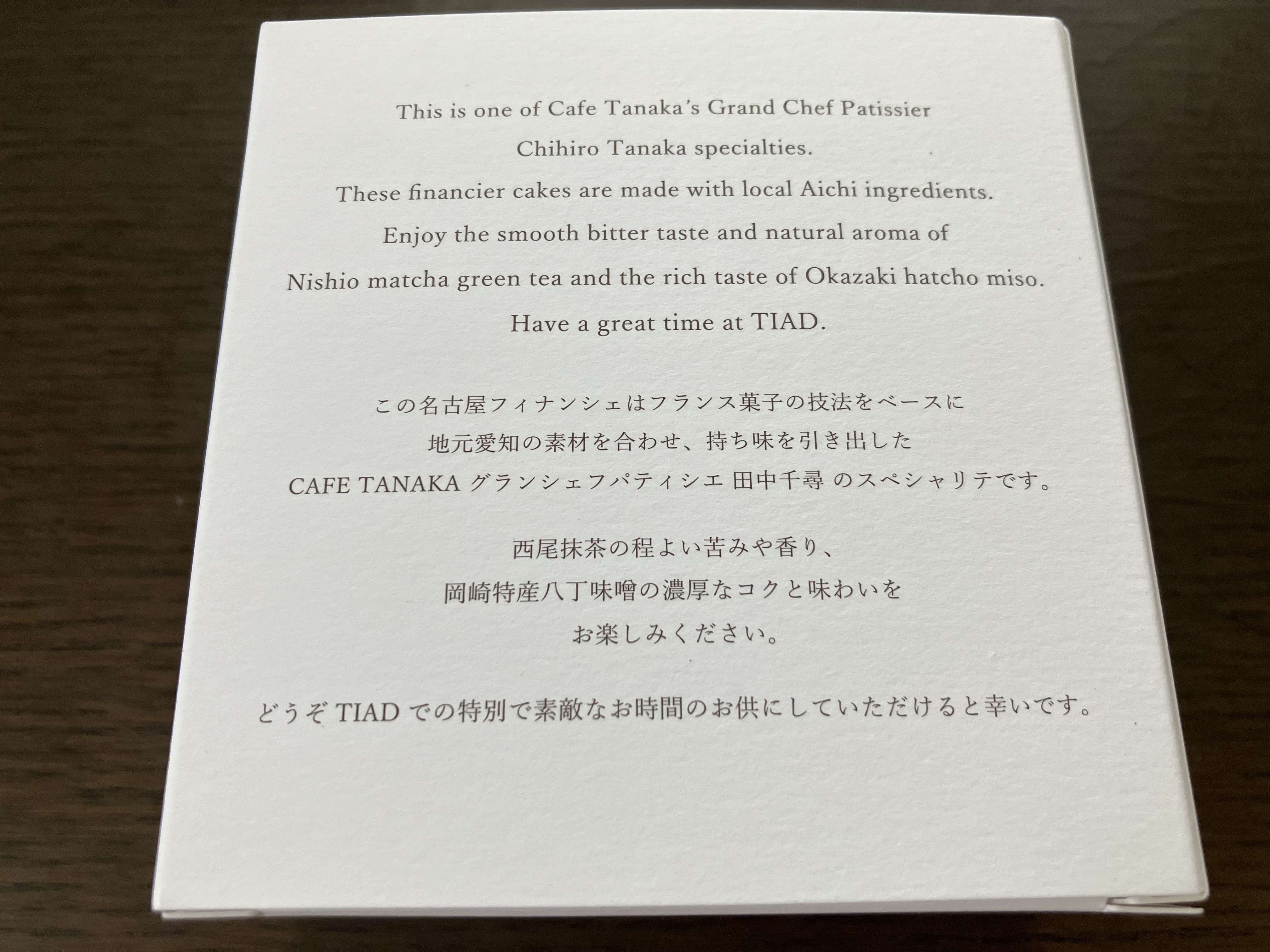 TIADでいただいたフィナンシェが、カフェタナカの田中千尋シェフとコラボしたものでした。西尾抹茶や岡崎の八丁味噌を使用したフィナンシェでとても美味しかったです。味噌味は、今まで食べたことのない味でした☺️美味しかったので、普通に販売してもらいたいくらいでした。人気シェフとのコラボ商品が食べれるだけで、TIADに泊まる価値ありです。