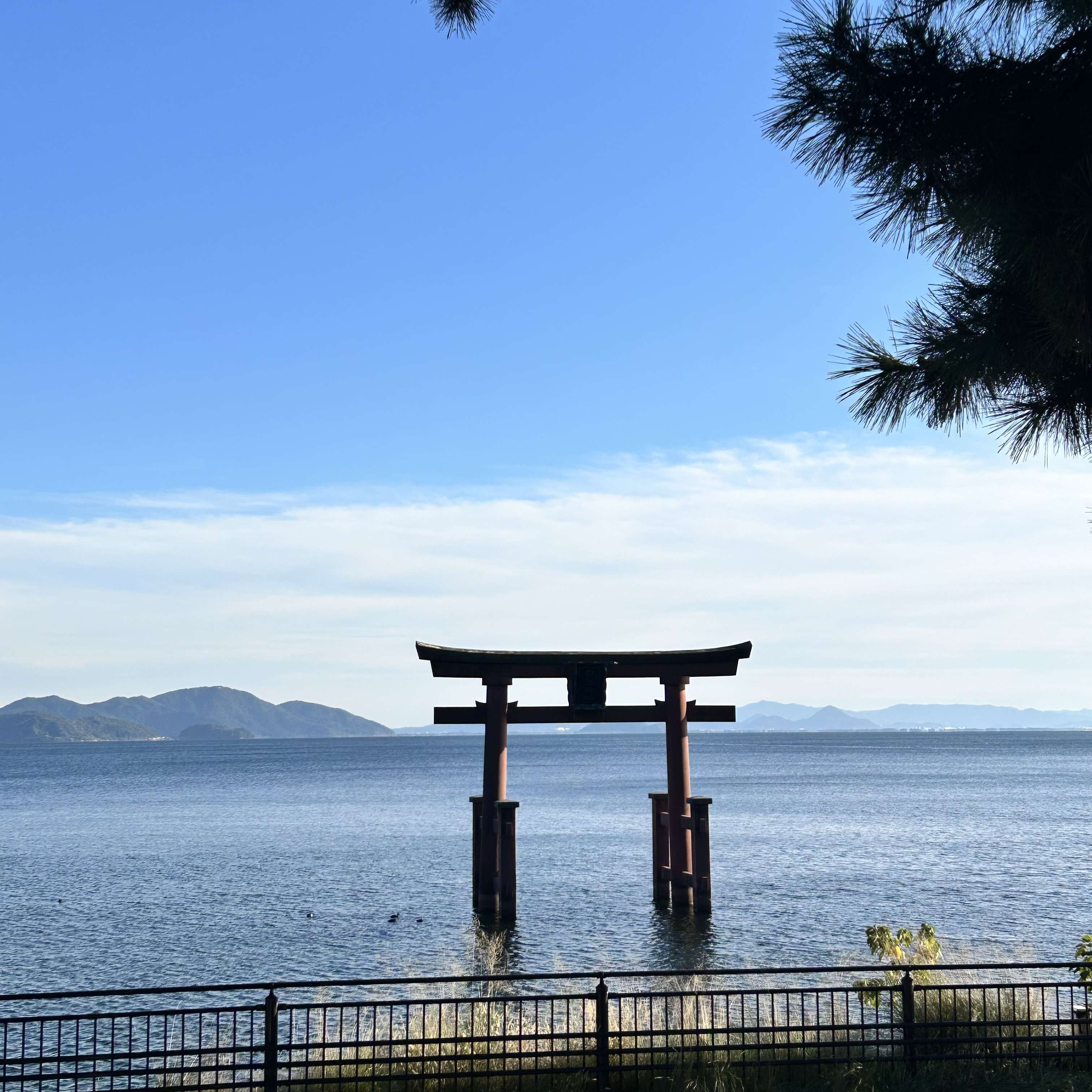 琵琶湖に鳥居⛩️が立ち、道路を挟んだ向かいに神社があります。