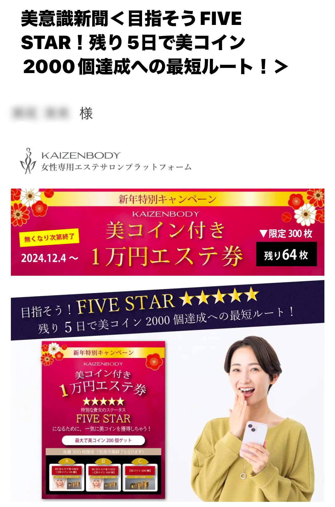案内が来てから、何にしようか考えて、Bのエステ券1枚&100美コインにしました。