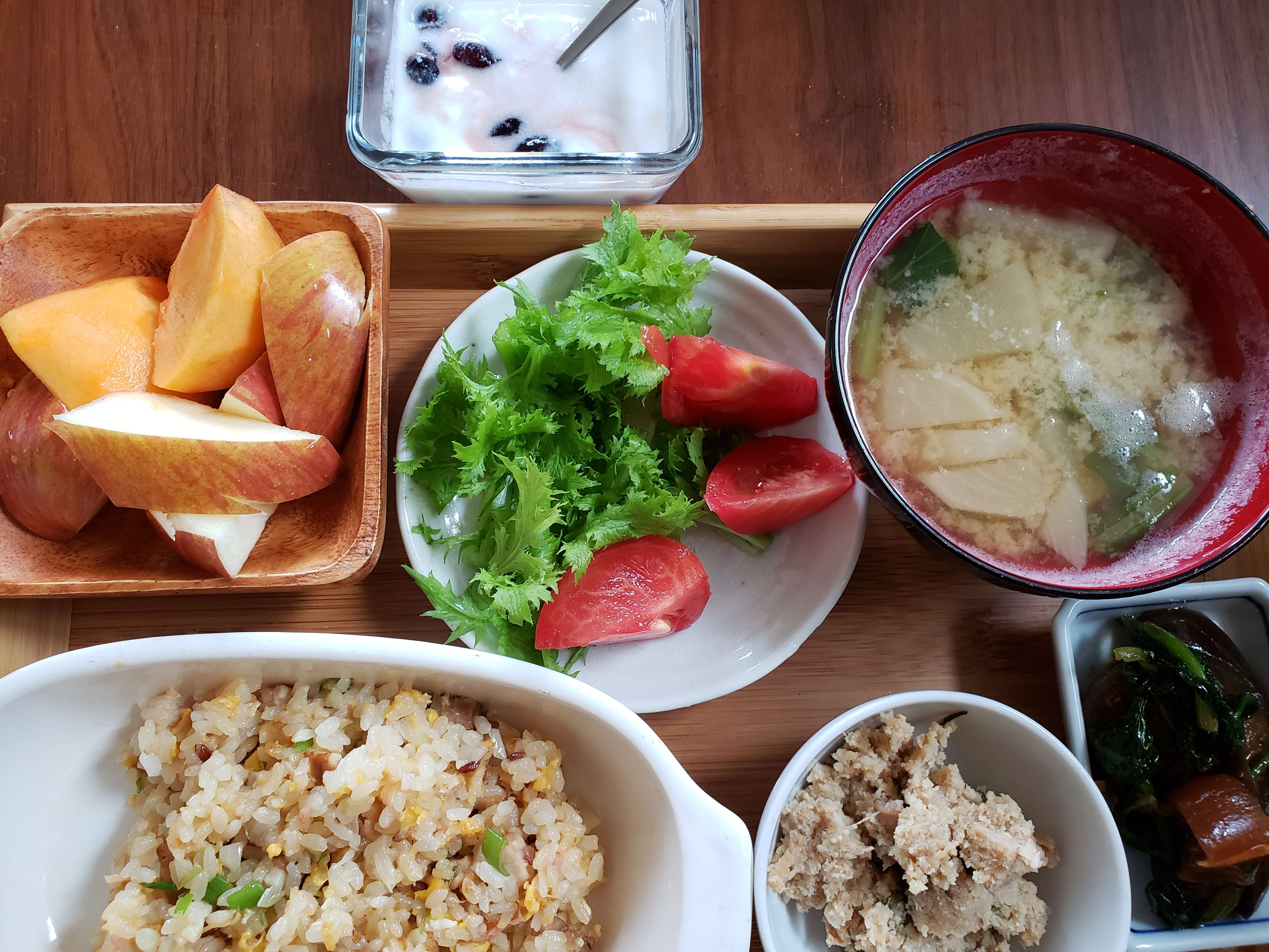ニンニク・卵・ネギ・紅ショウガ・豚の角煮いりチャーハン、インゲン・シイタケ・人参・揚げいりおから、茄子とほうれん草の煮つけ、カブの味噌汁、ワサビ菜とトマトのサラダ、読黒豆とはちみつヨーグルト、リンゴと柿 21品目 冷凍レンジチンで20分朝食作り