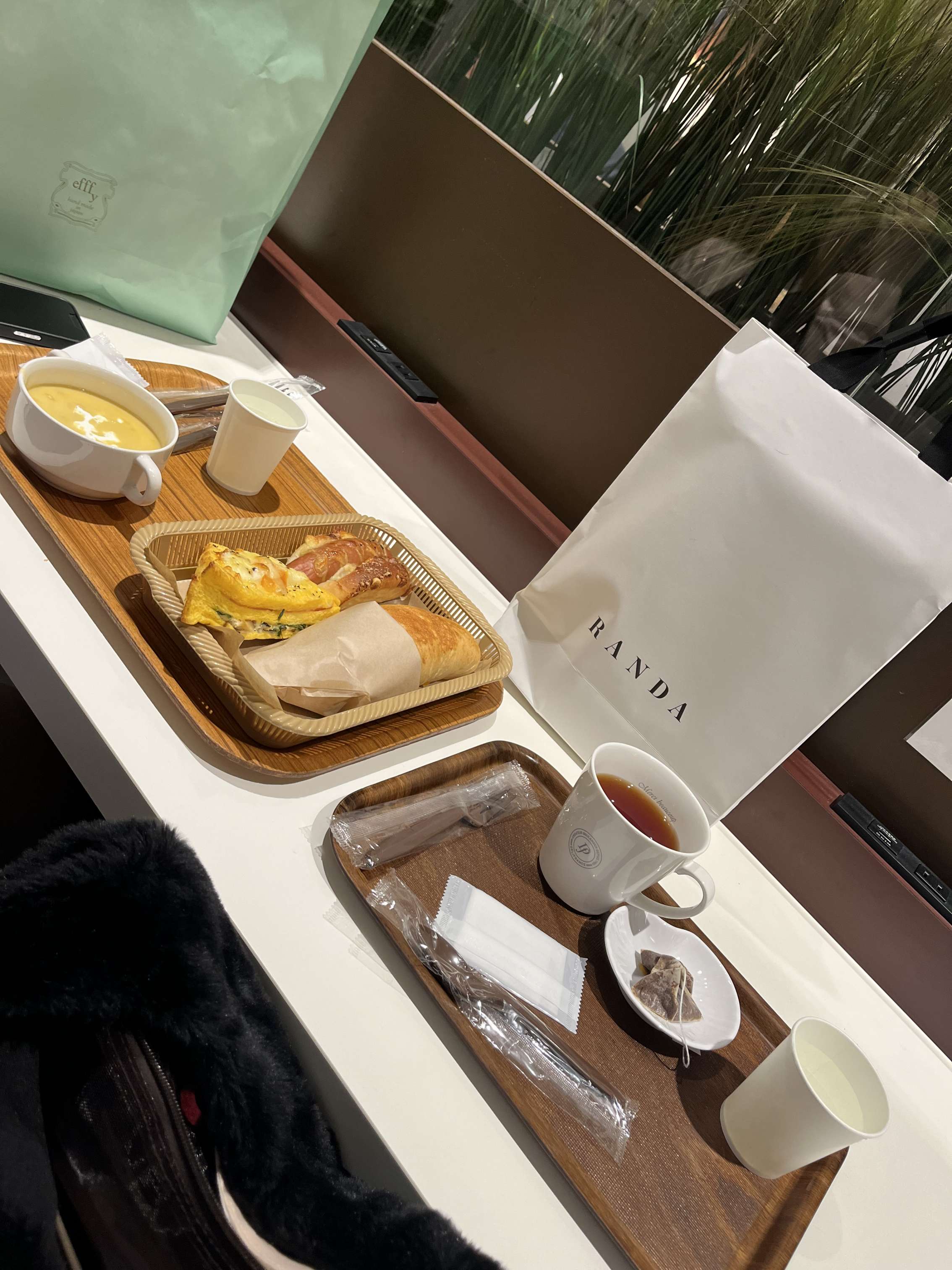 休憩場所は気軽にパン屋さん。ルイボスティーにしました。パンを温めてくださり美味しかったです