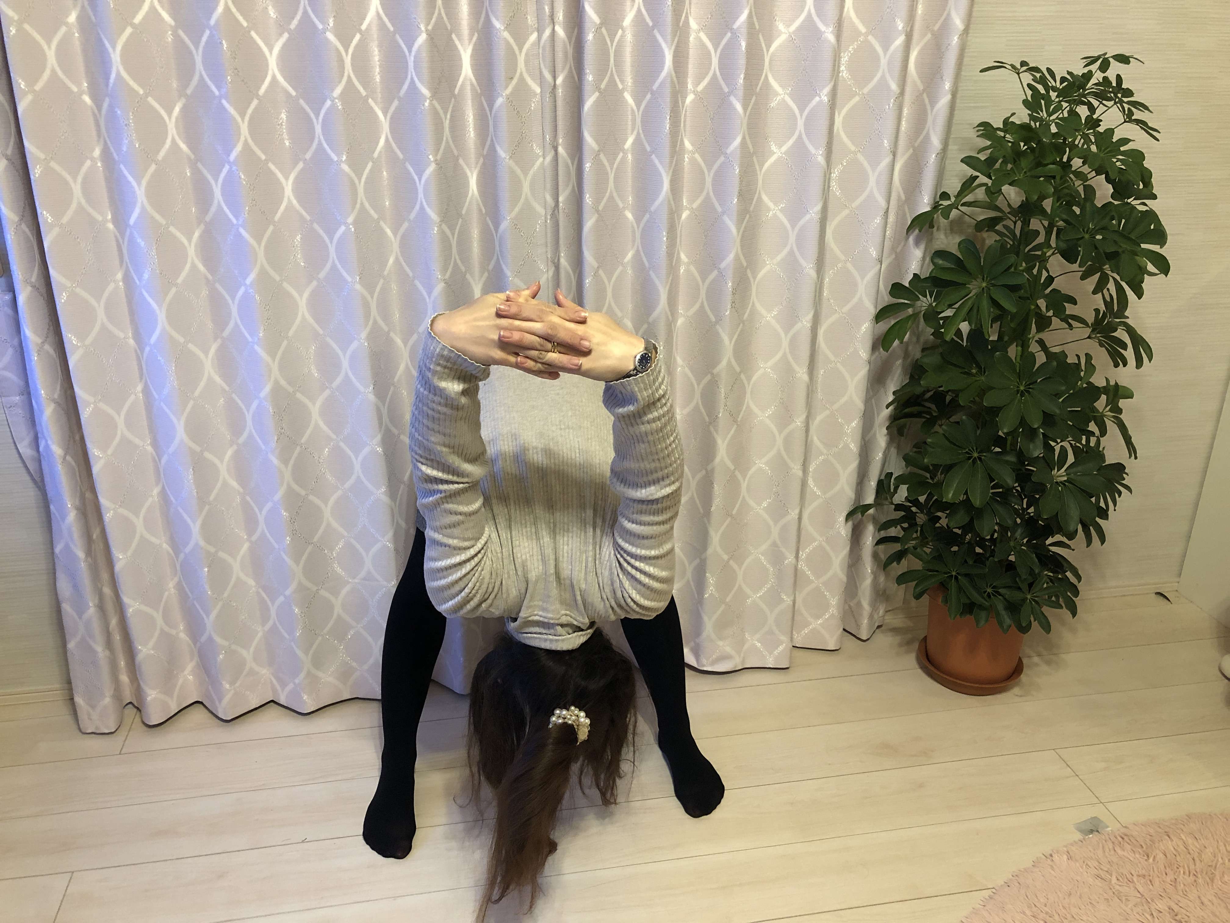 昔はべったり床にまっすぐついたのに、今はなかなか厳しい!笑。