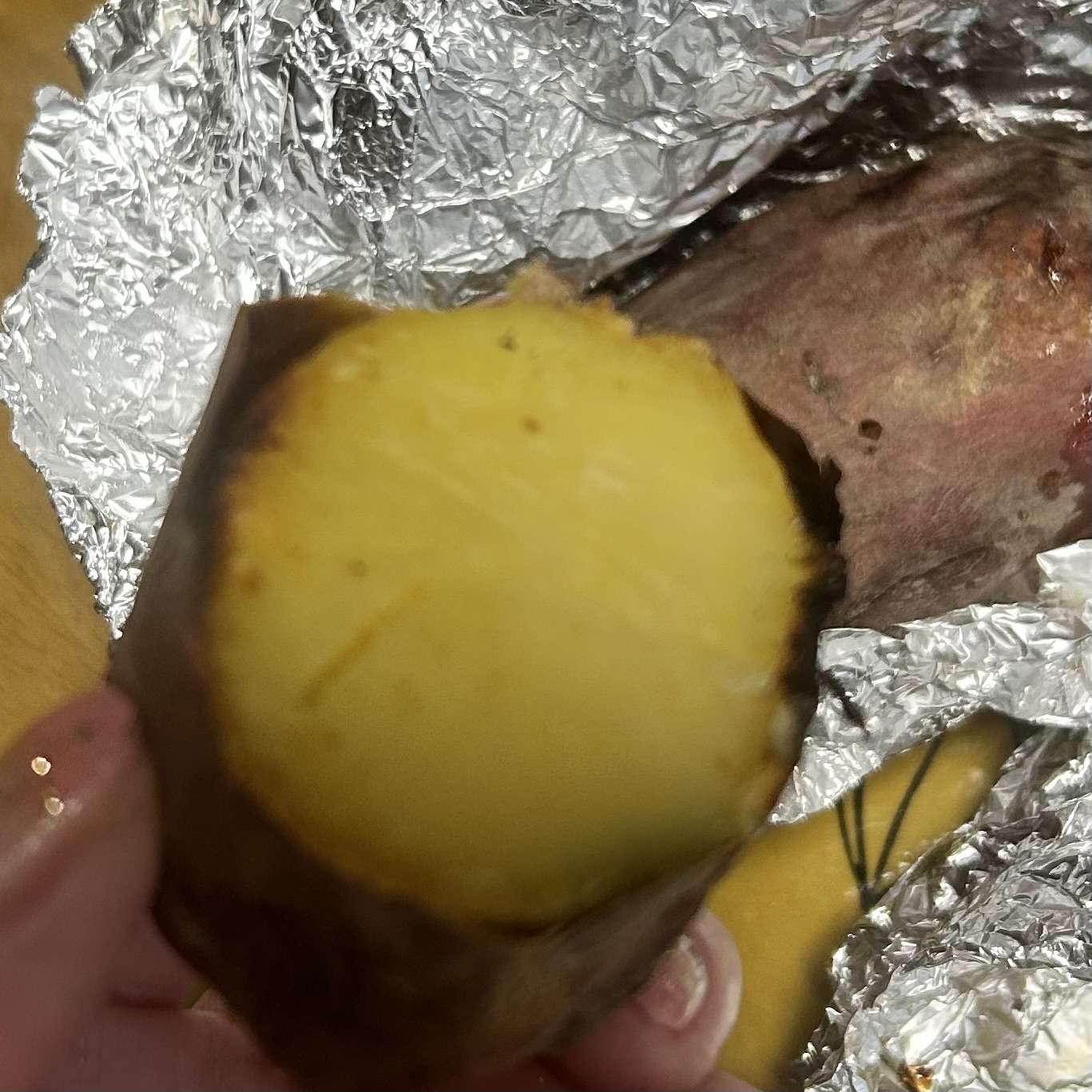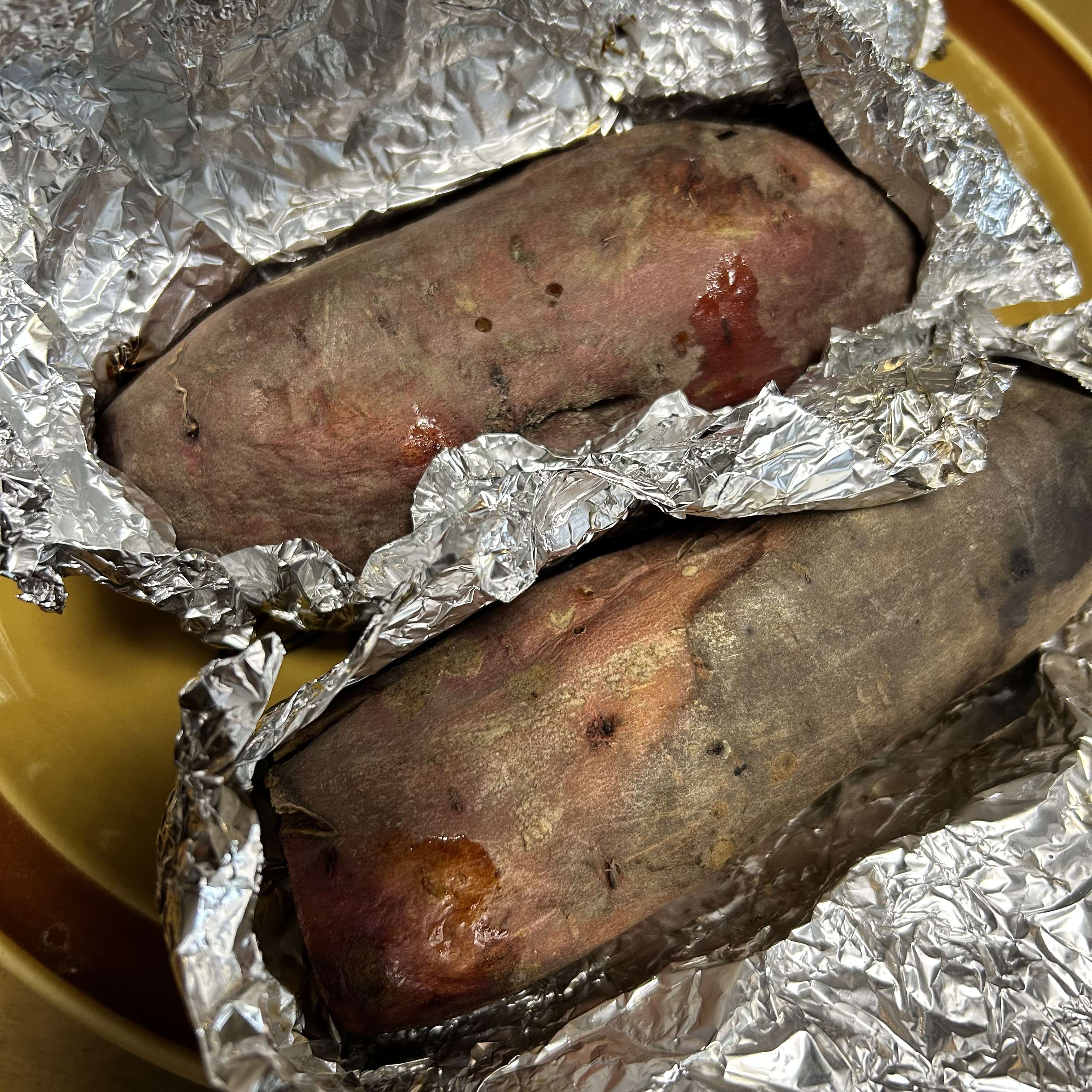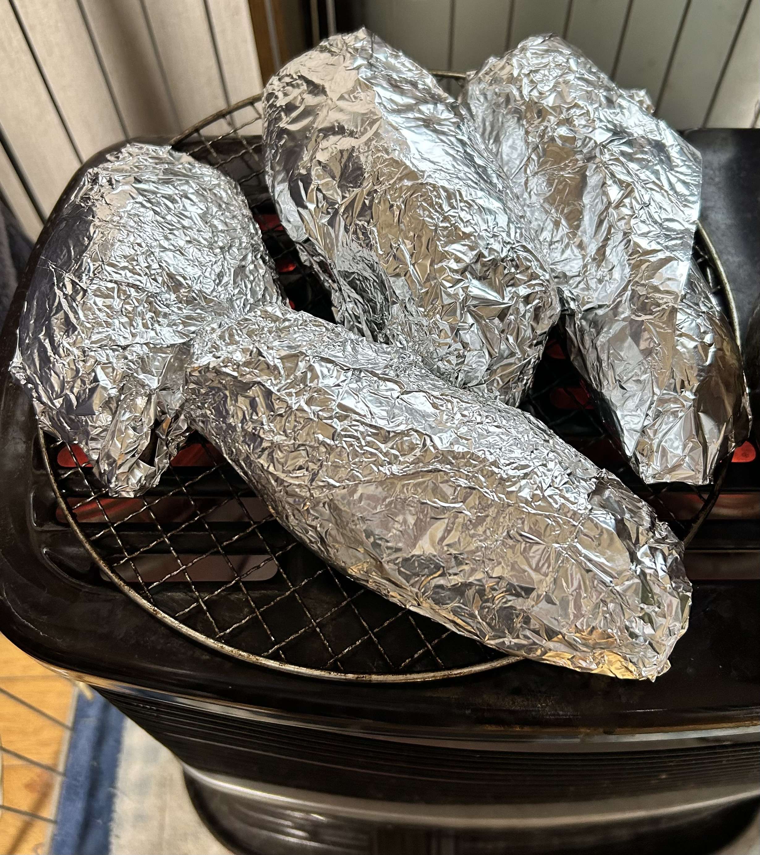 アルミホイルにしっかり包んで、反射式ストーブの上に2.3時間置いてじっくり焼きます。