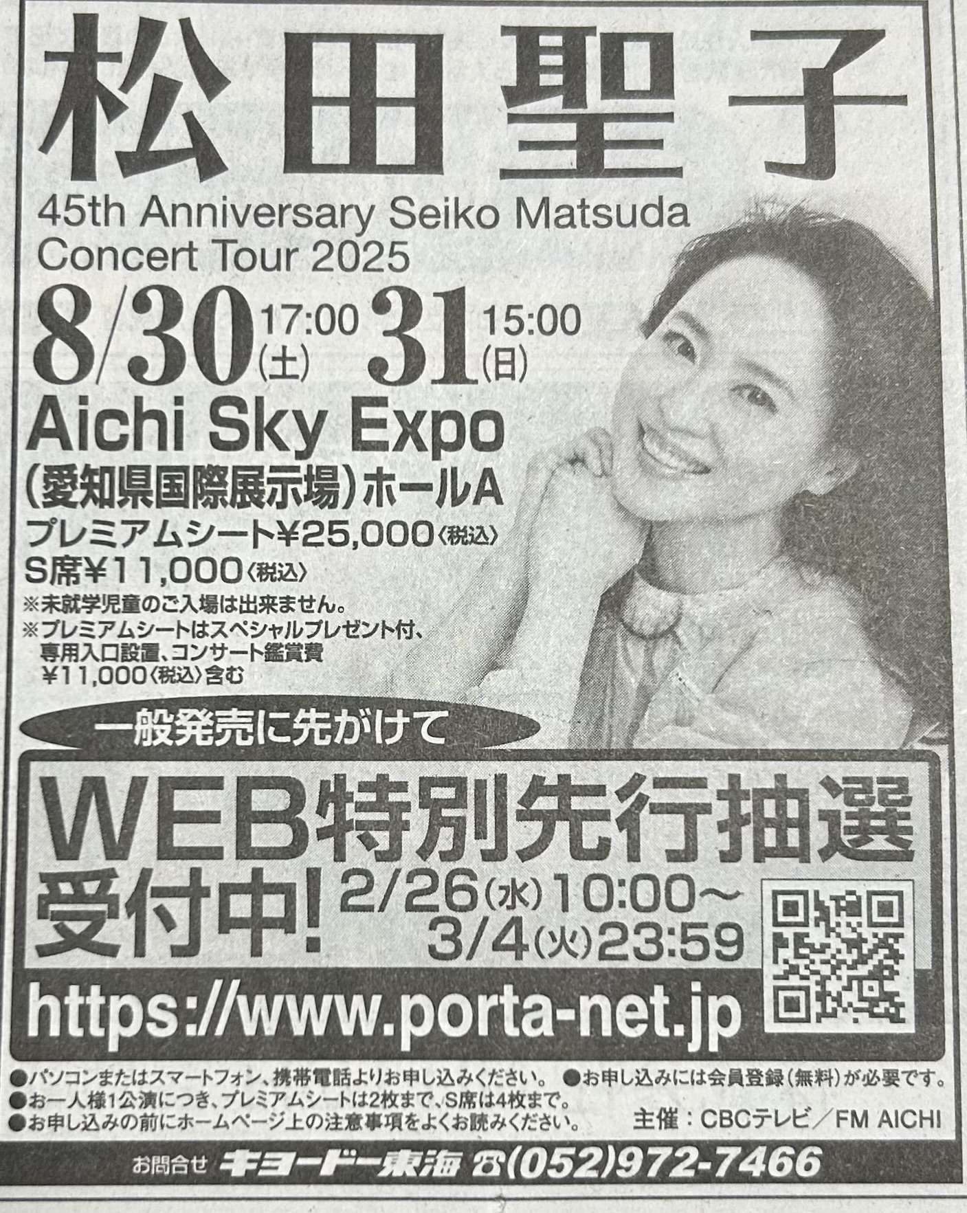 今朝の新聞に松田聖子さんのコンサートの案内が載ってました。