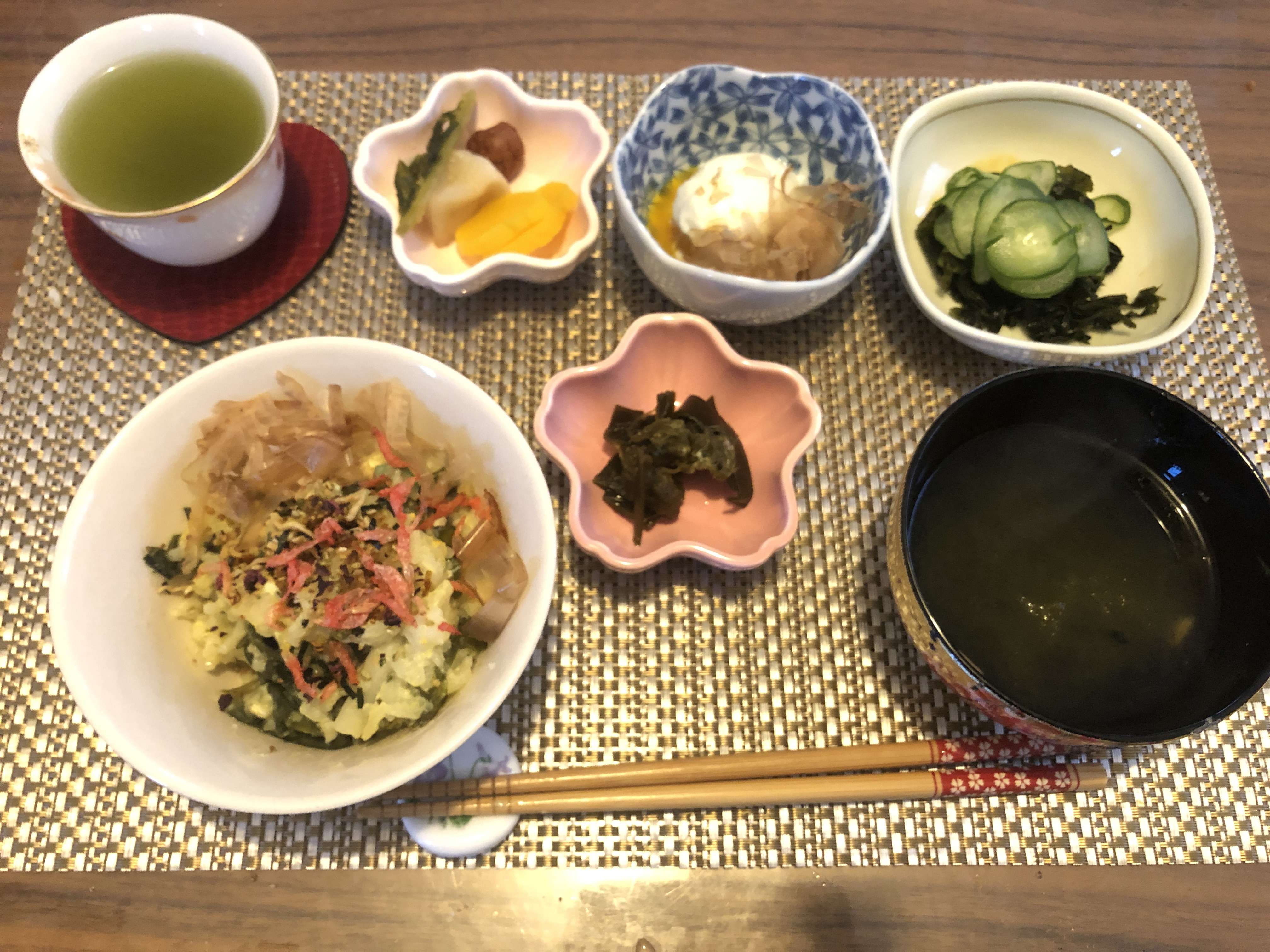 自然とプチ断食になったので、吸収もしやすいことを考え、海藻や玉ねぎ、桜エビを卵で煮込み、お腹に優しいおじやに♪それ自体に味はつけず、自家製の製糠漬けや佃煮と美味しくいただきました♡