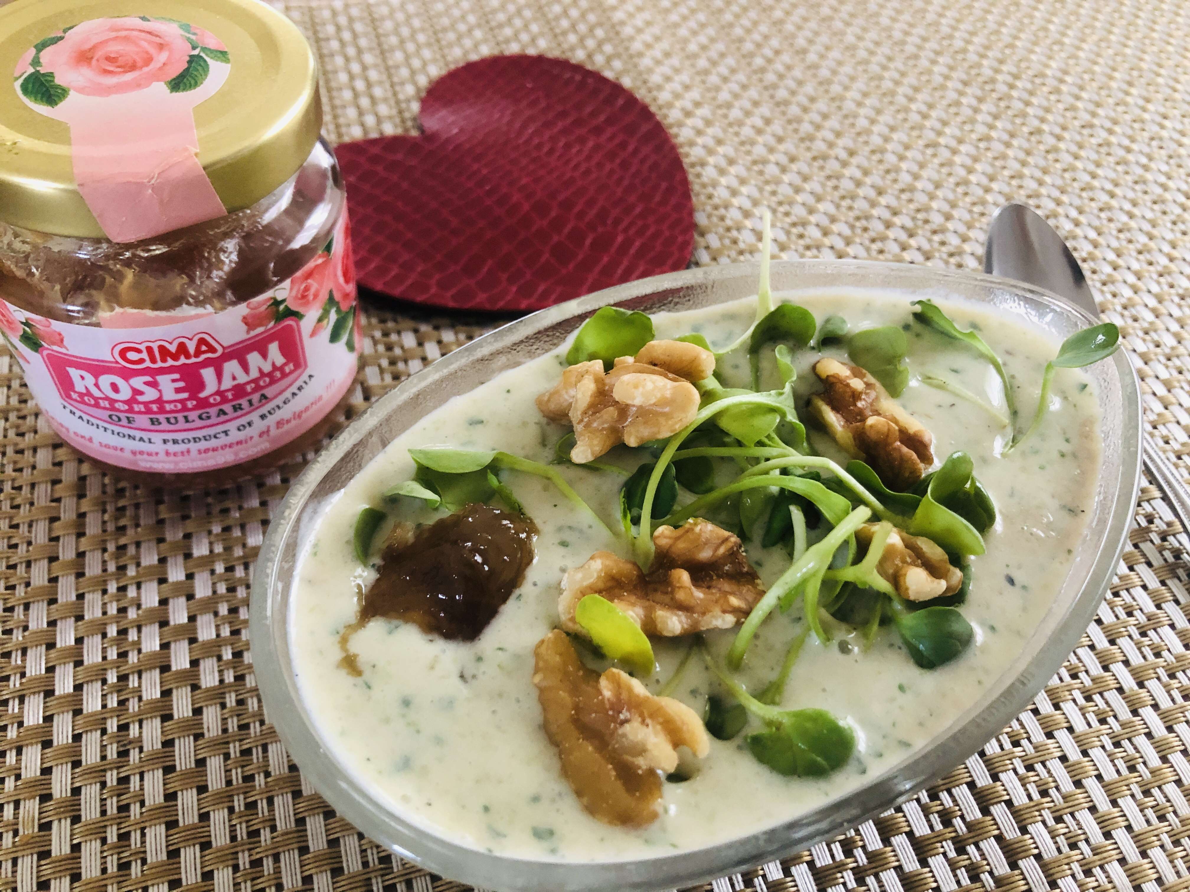 自家製スムージードリンクが朝食に欠かせない定番になってきましたが、今日はヨーグルトとバナナを多めにスムージーに混ぜ、つまみ菜とくるみ、ブルガリアのバラのジャムで食べてみました♡
