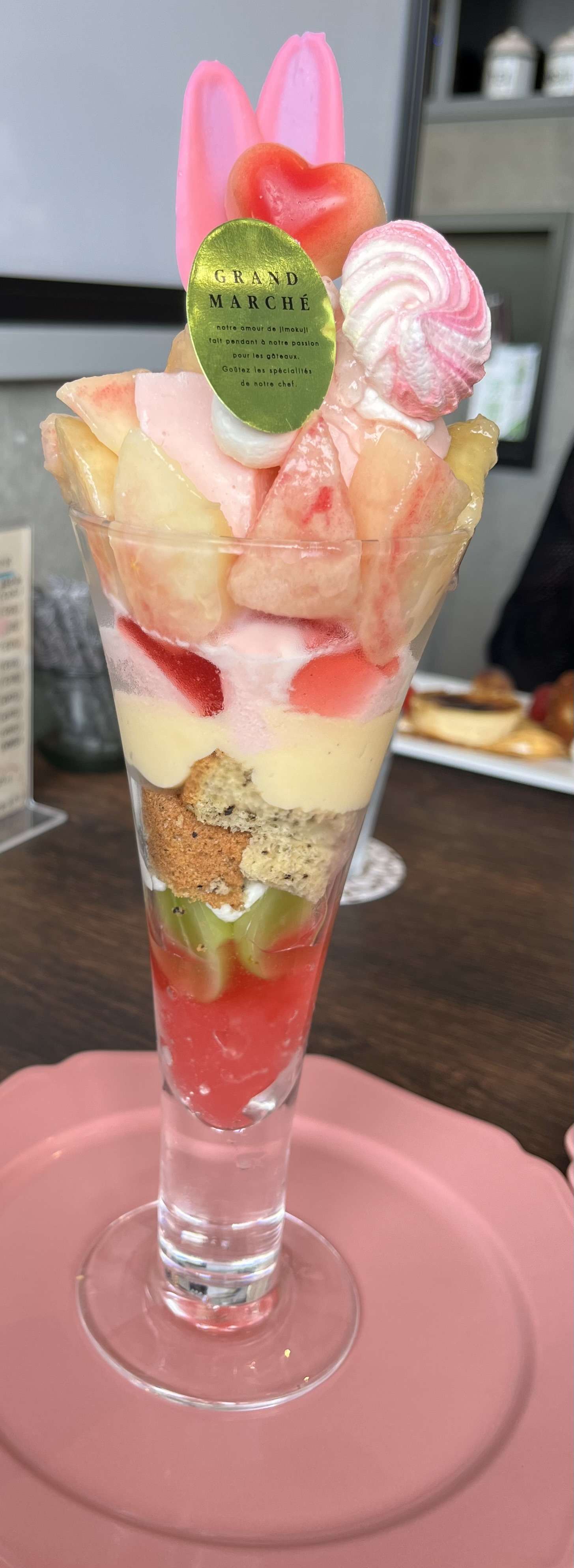先日食べた「桃パフェ」です。洋菓子屋さんらしく、お洒落でお菓子も美味しかったです