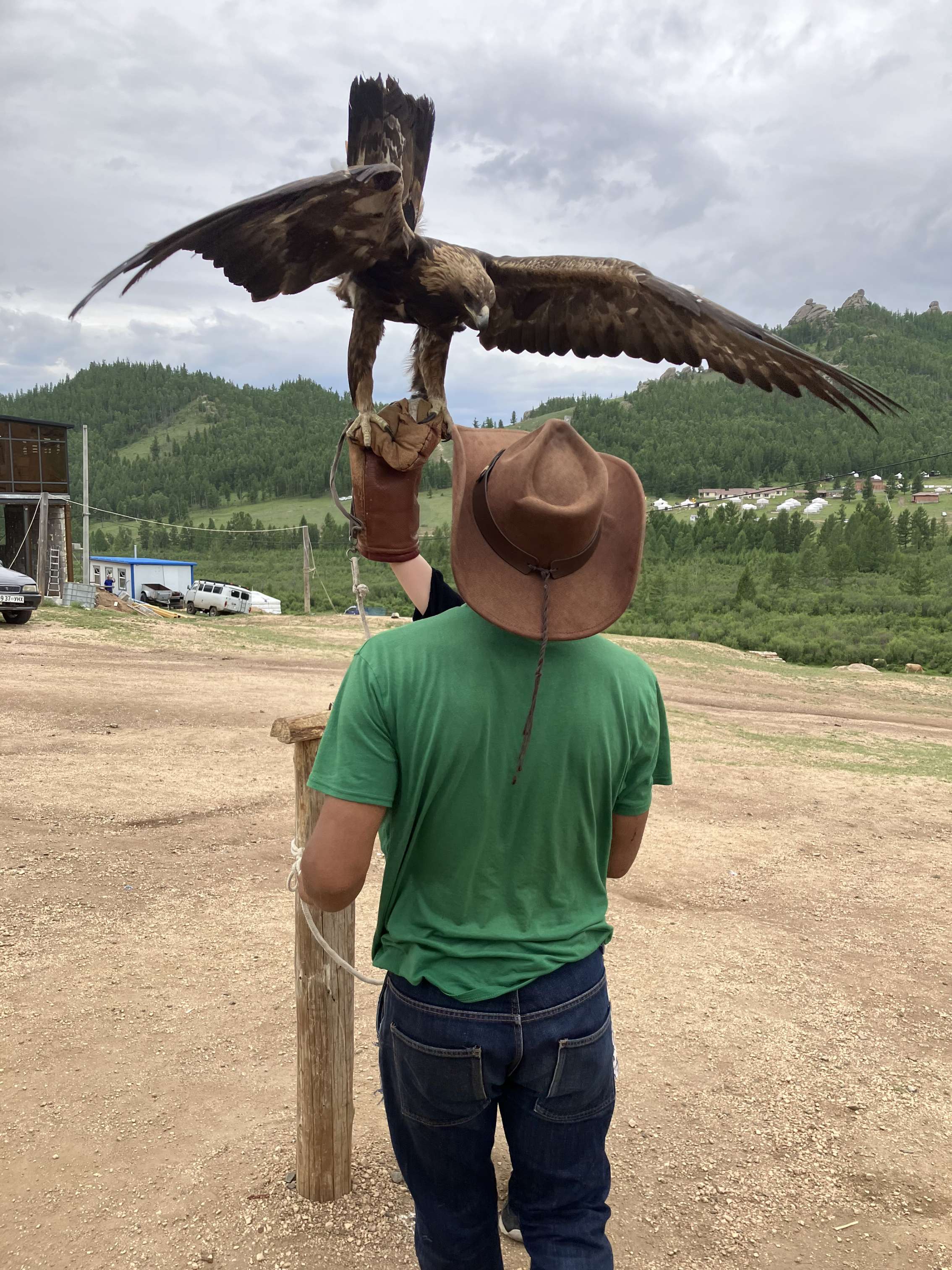 近くに鷹もいて手に乗せて写真を撮ってもらいました。上下に動かすと羽を広げて迫力がありました。