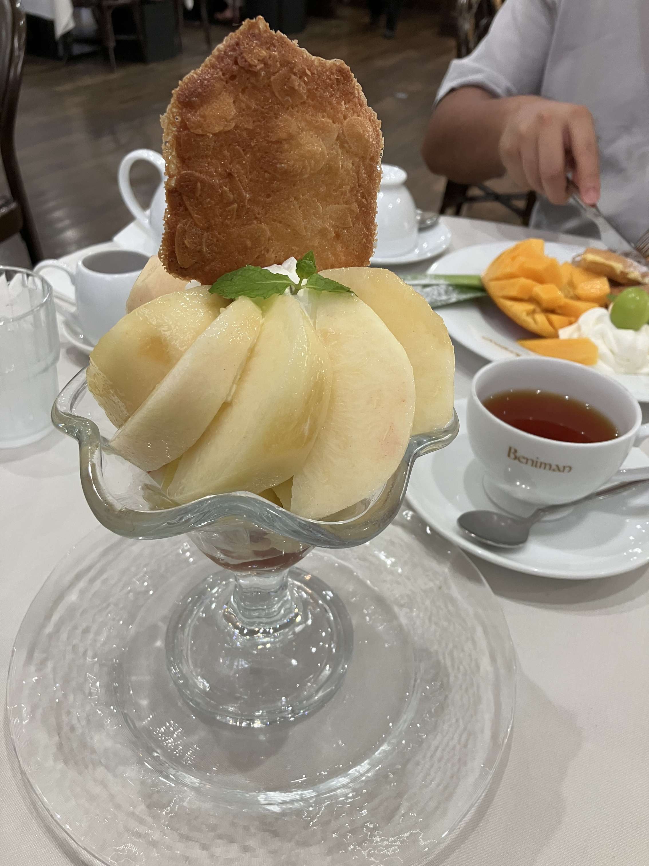 今年初の桃パフェも楽しめました。宮崎マンゴーも少し分けてもらいました。どちらも美味しすぎました。夫が中学から通うお店で、以前結婚祝いにフルーツを頂きました。感謝です。