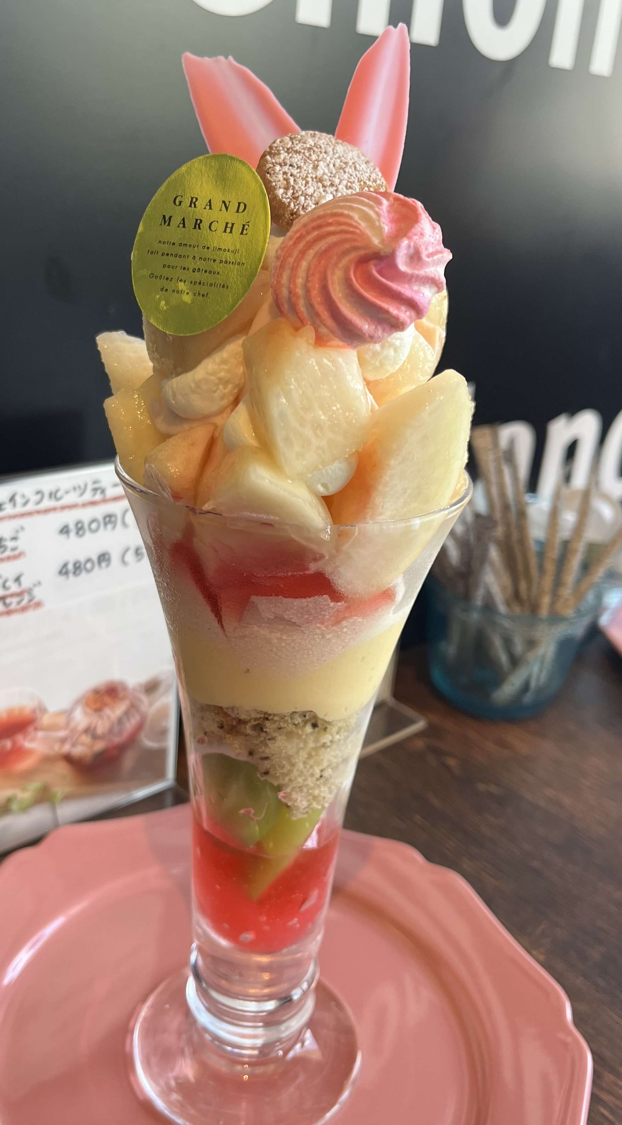 以前行ったケーキ屋さんの桃パフェにしました。ケーキもタルトがいっぱいで美味しそう🩷
