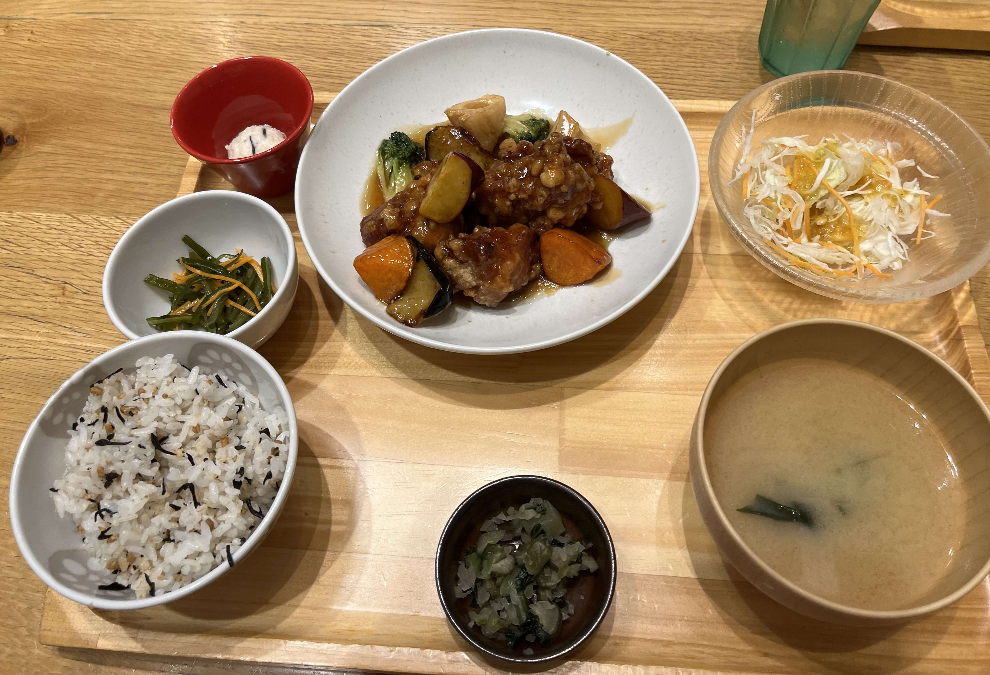 「おぼんdeごはん」の「ごろごろ根菜と鶏肉の黒酢ソース」定食です。美味しかったです