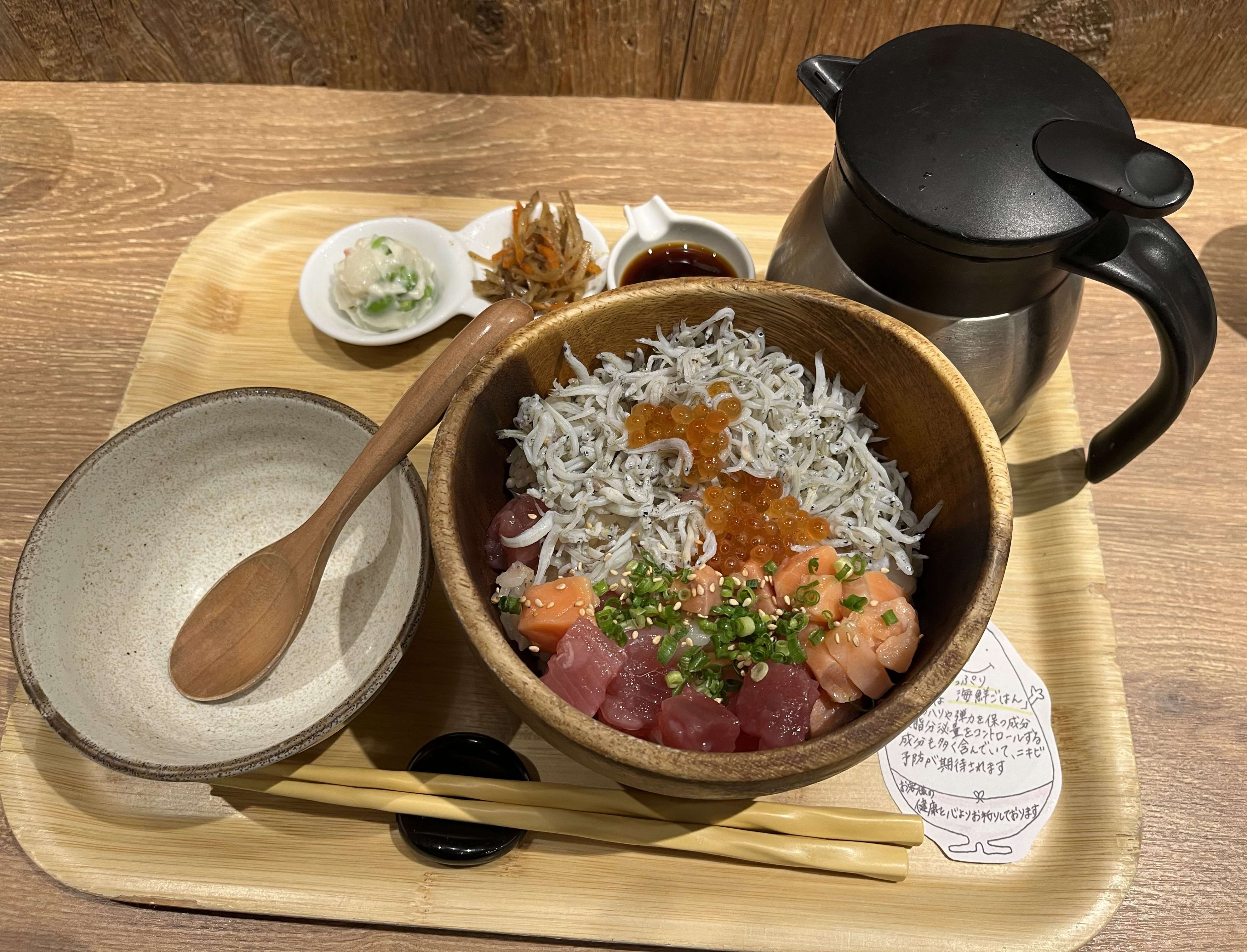 しらすと、お刺身。最初は普通に、あとはお出汁でお茶漬けでいただきました