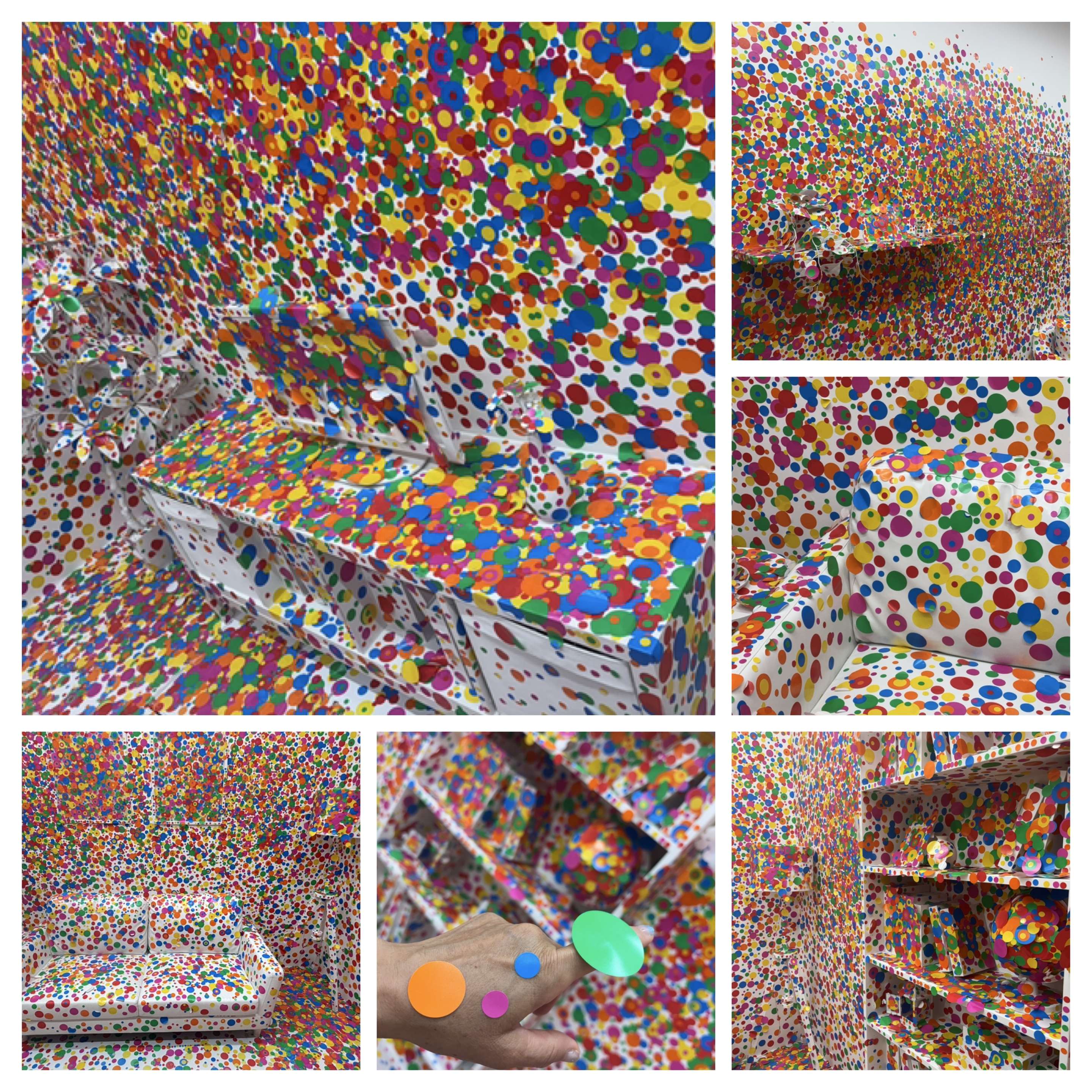 参加型プロジェクト《オブリタレーションルーム》があった。真っ白な壁真っ白な家具に私たちが自由にステッカーを貼っていく。草間彌生の「自己消滅」に参加できる作品だ。