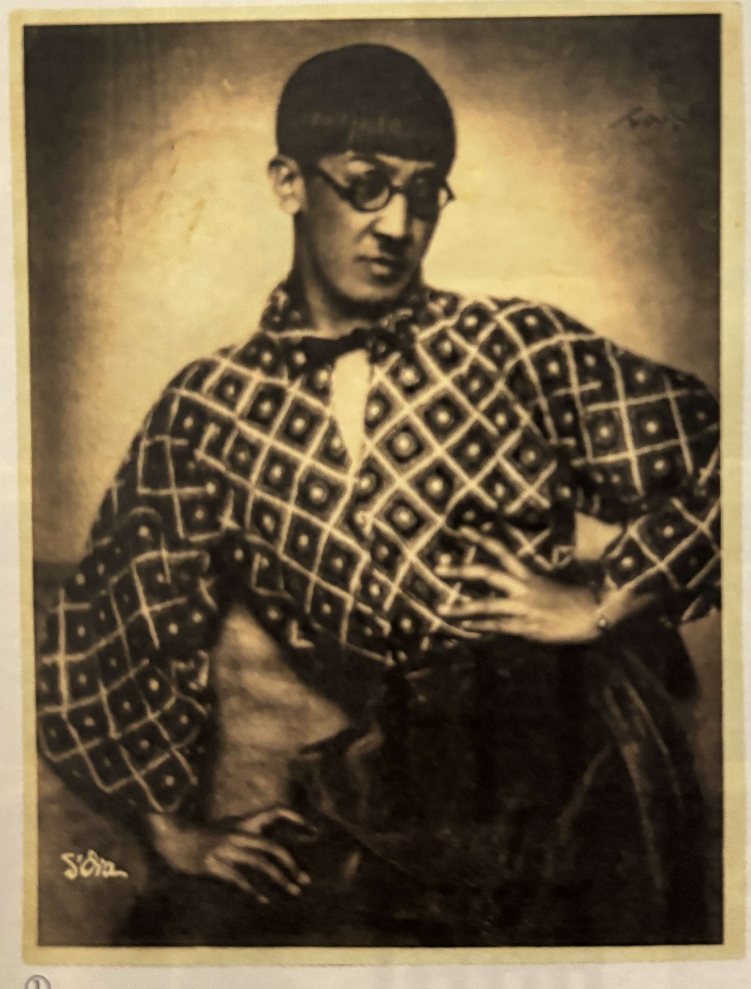 おかっぱ頭に丸メガネ、髭に洋服、そしてポーズまで、明治生まれの人とは思えないお洒落なモデルだ。