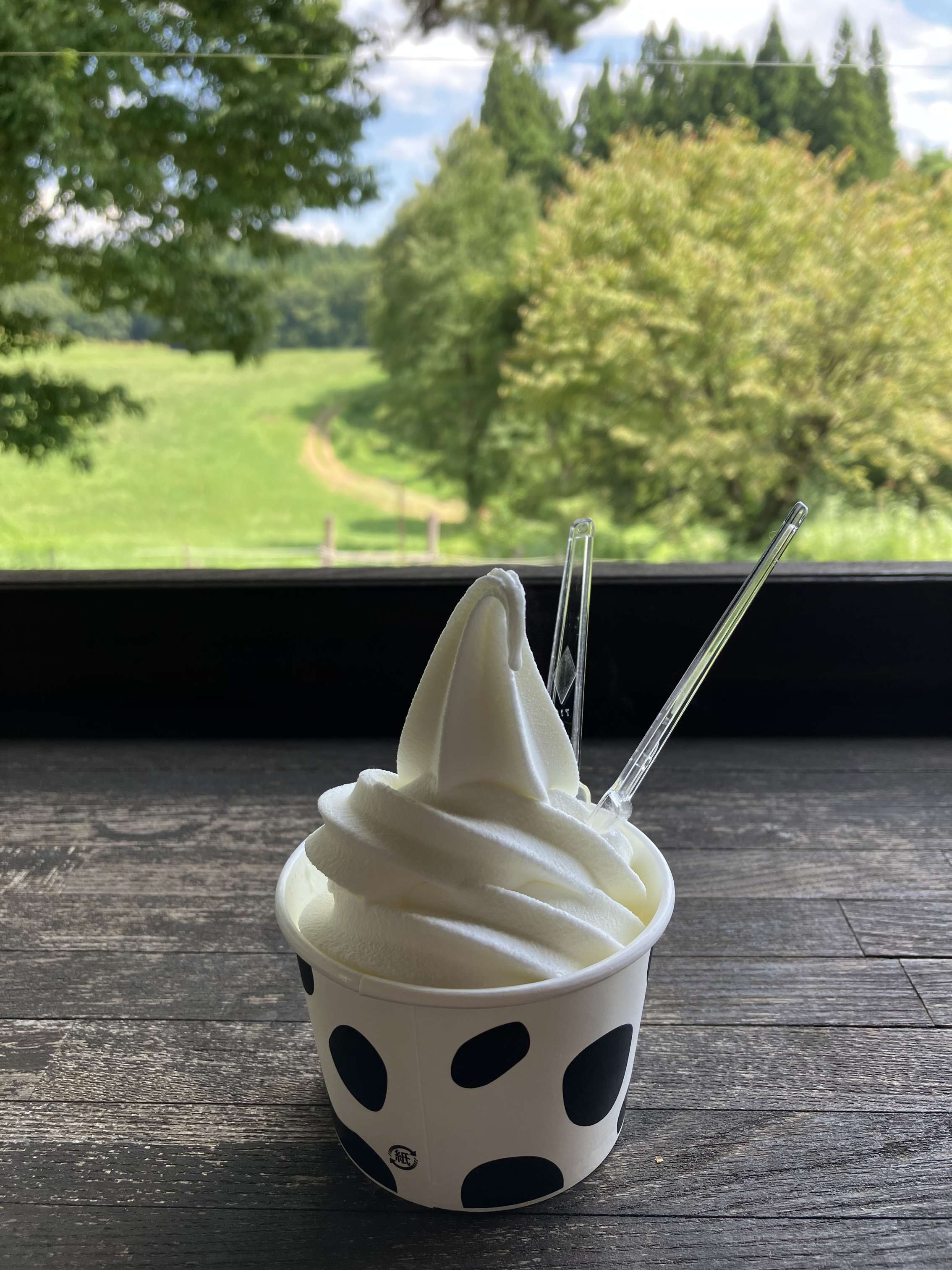 ソフトクリームのカップも牛柄でとても可愛かったです。自然の中で食べるとより一層美味しく感じます。