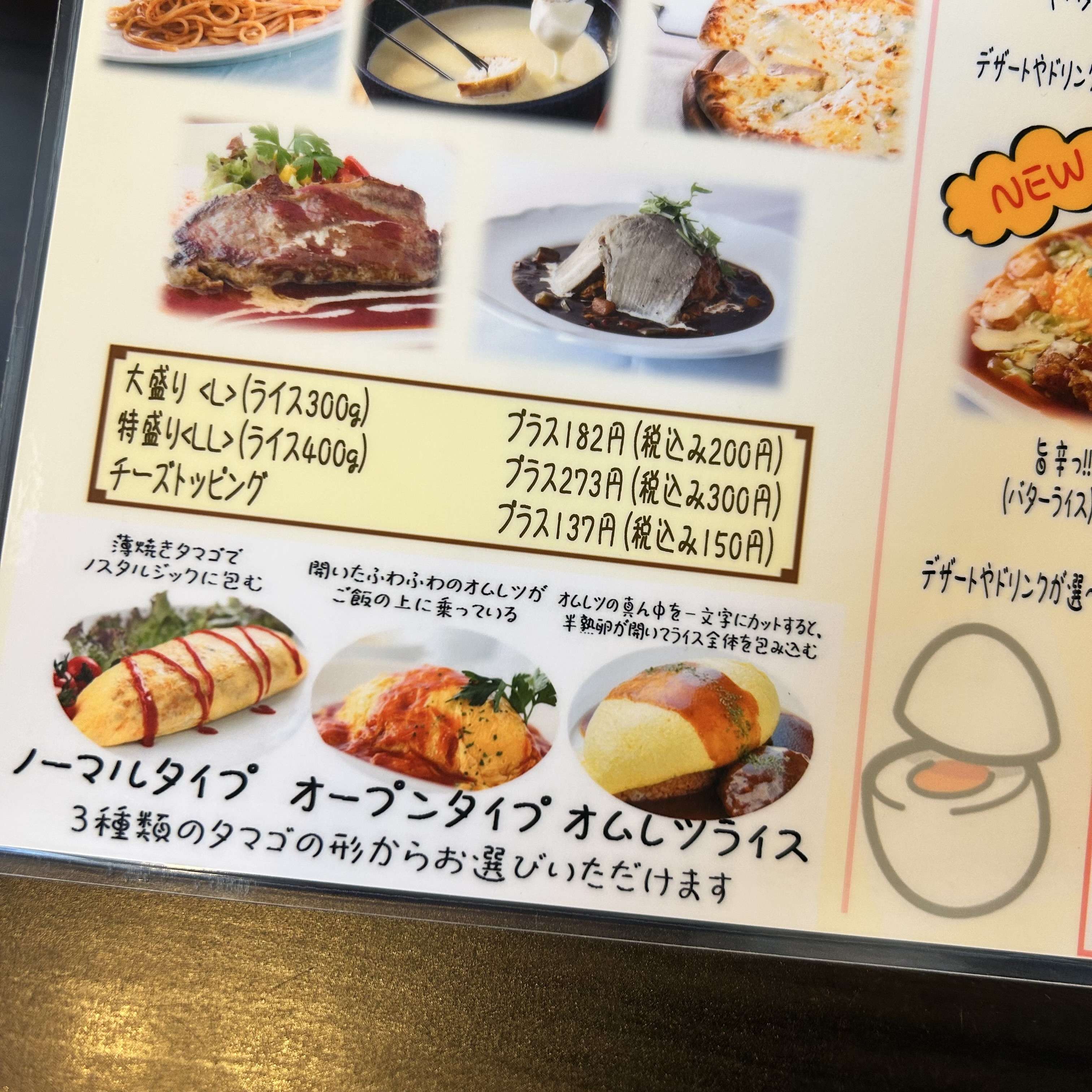 ご飯の種類(ケチャップライスorバターライス)、卵の巻き方(ノーマルorオープンorオムレツ)も選べるので、種類が多くて迷いました