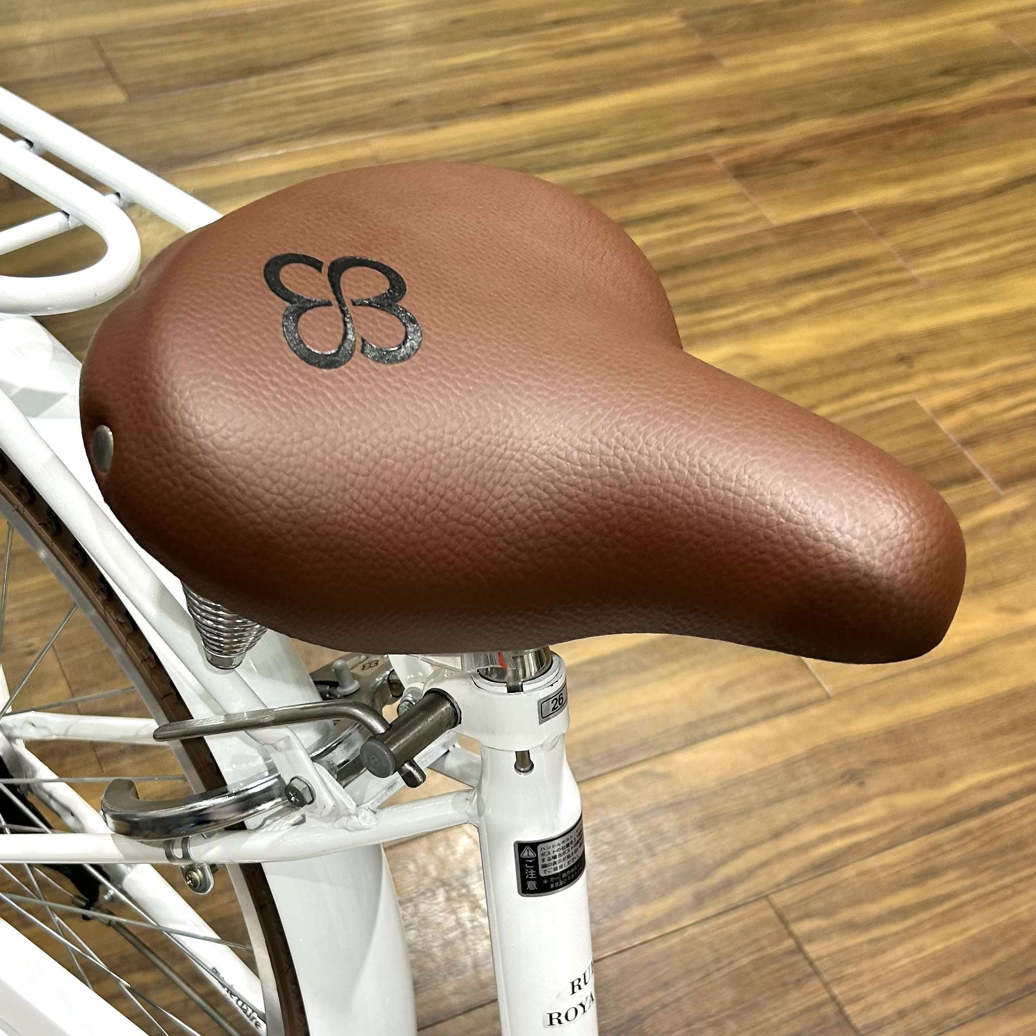 相場が分からないけど、可愛いロゴの入った白い自転車が気に入りました。