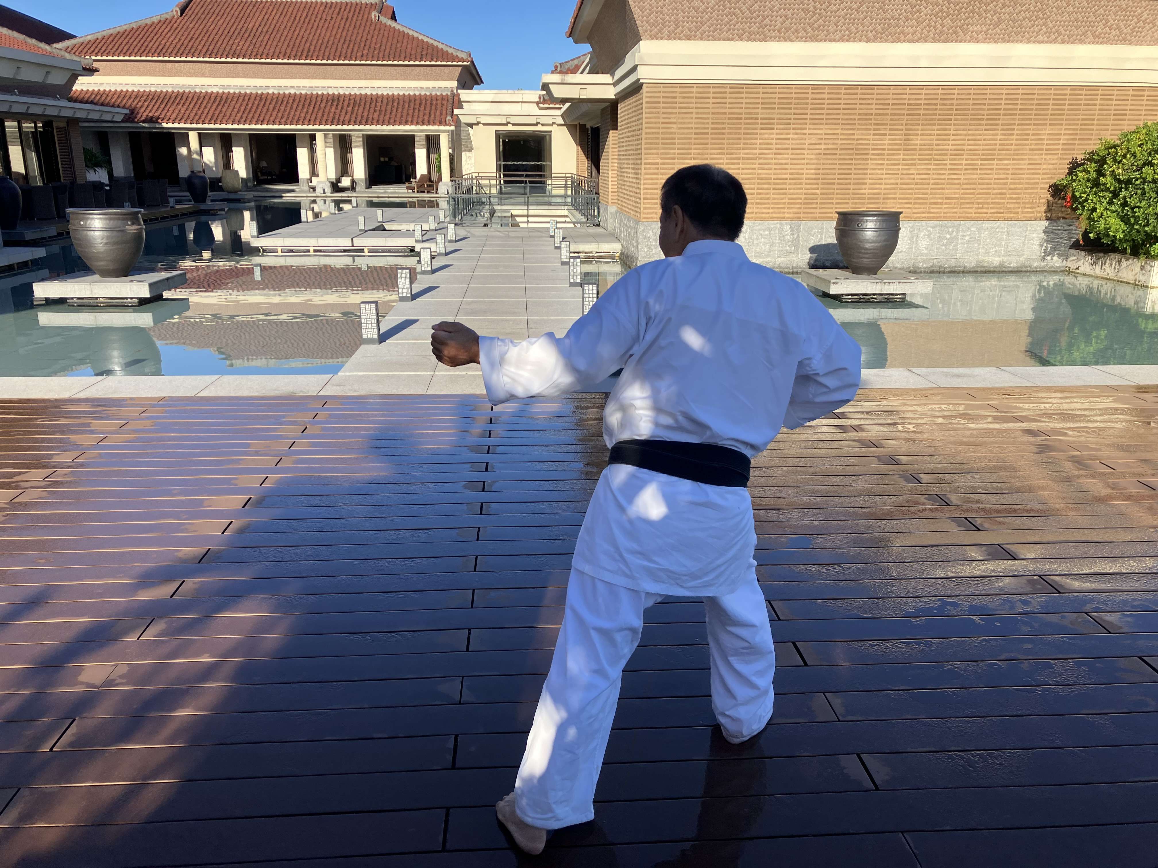 朝は全沖縄空手道連盟の会長に空手のレッスンを1時間してもらいました。蹴り技を褒めてもらい嬉しかったです。