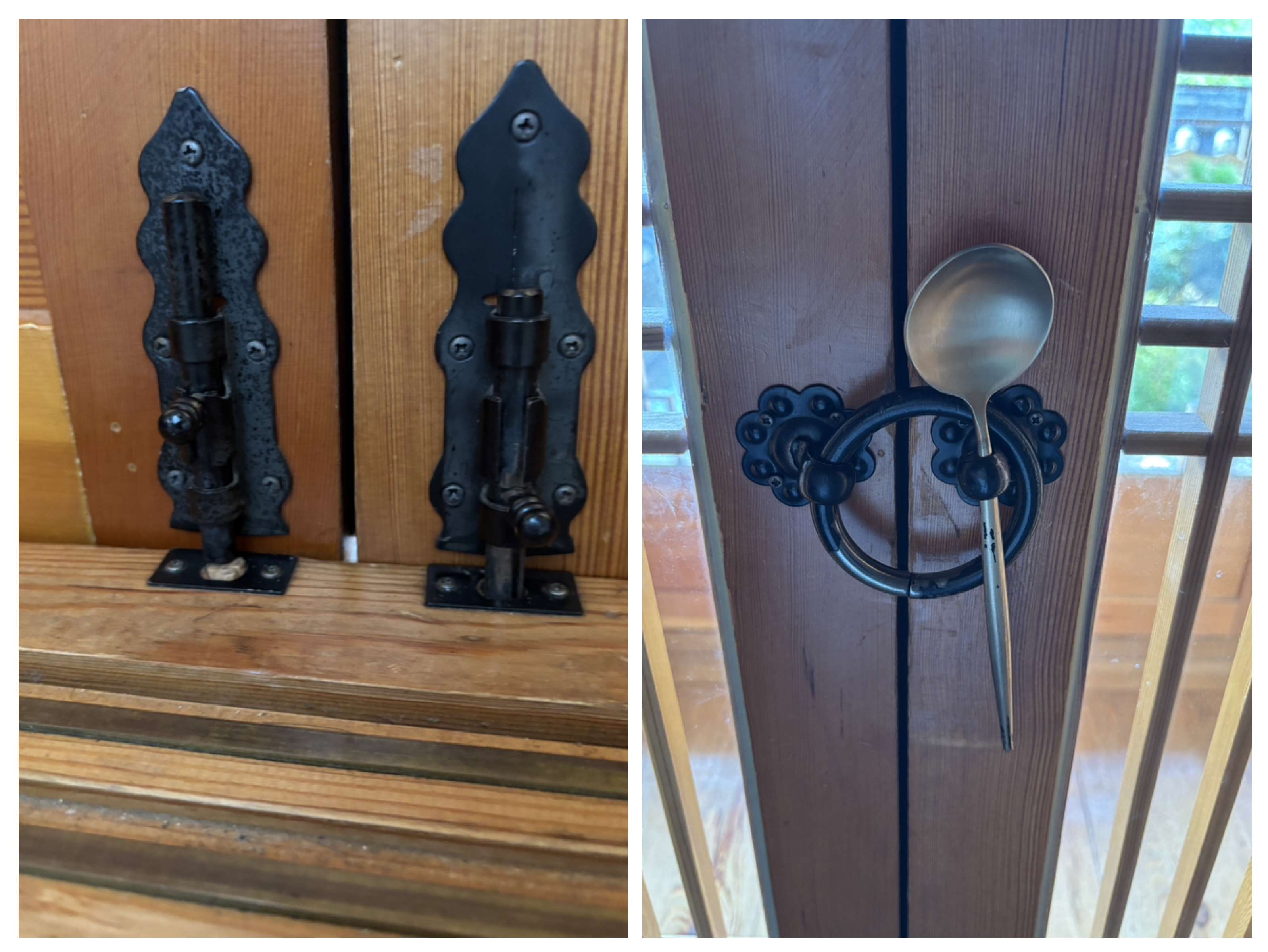 鍵も昔風で内側からかける鍵はなんとスッカラ(スプーン)。ちょっと心もとない。外出時の外側からかける鍵は南京錠。